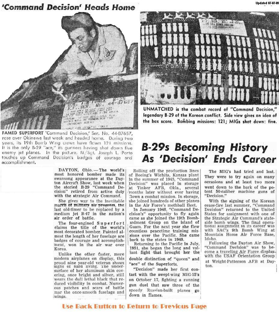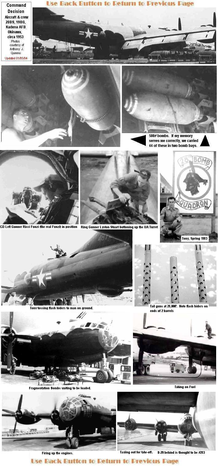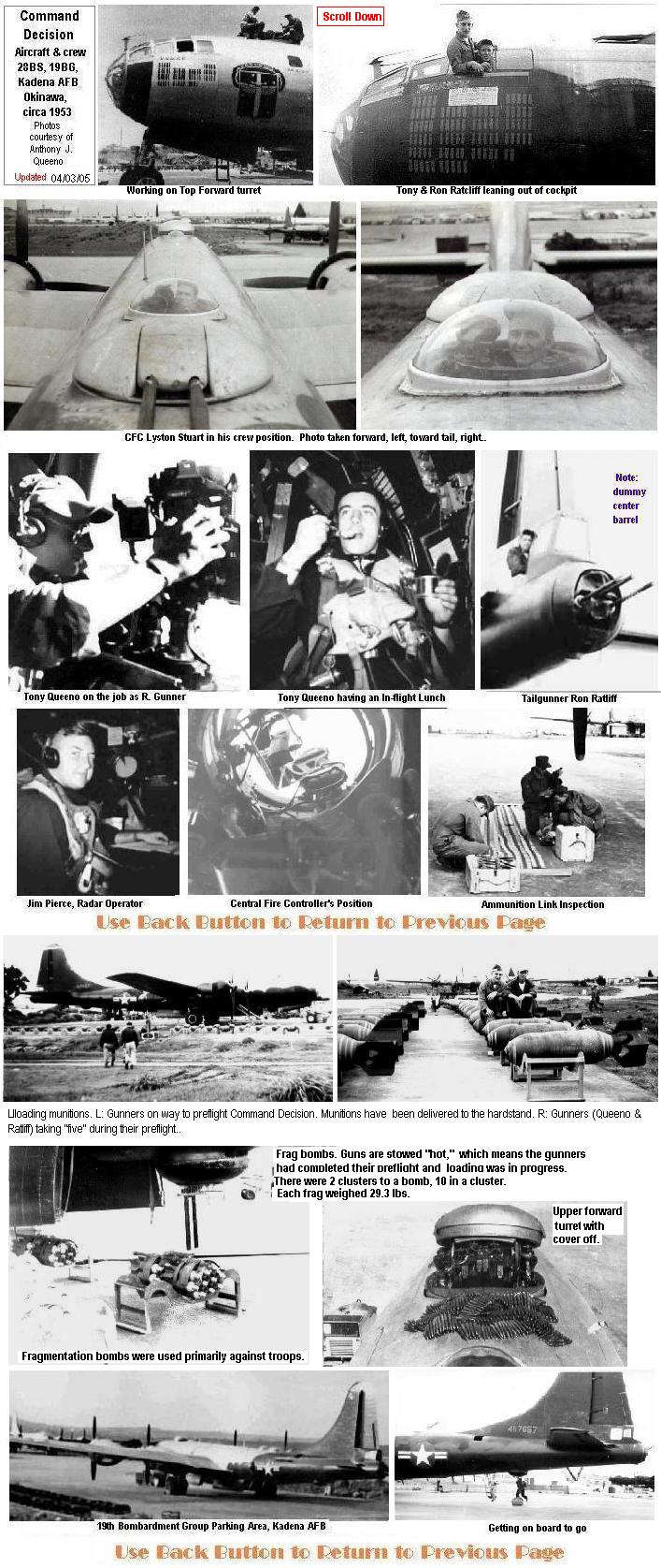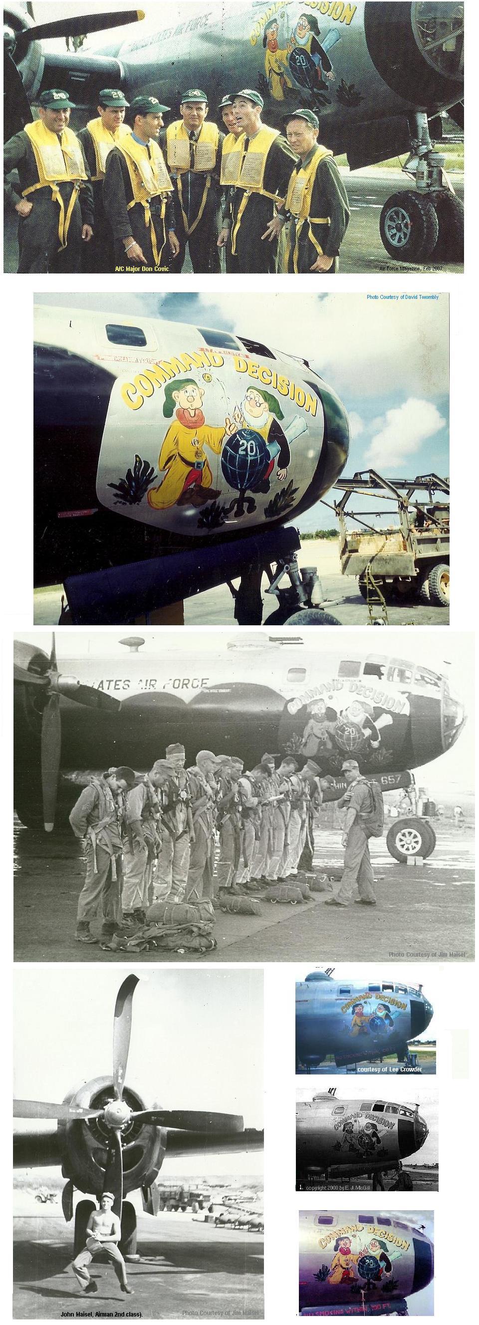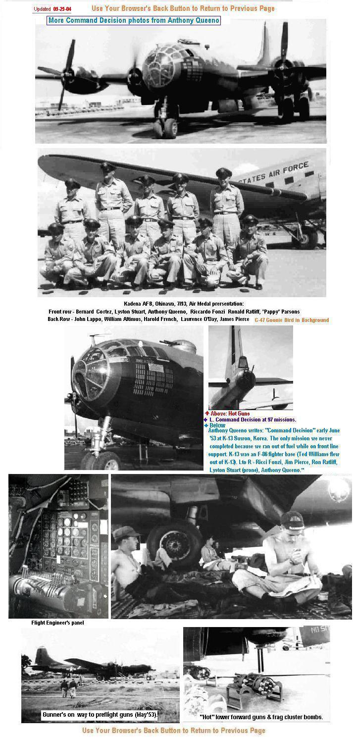 Anthony J. Queeno was assigned to Command Decision from Jan '53 through August '53.  Tony wrote, "We were the last crew to fly her in combat (on) the day they signed the truce . . .  in the air just hours before it was to take effect. We were supposed to fly her stateside but our A/C delayed a month so our Radar Operator could keep his promotion."
