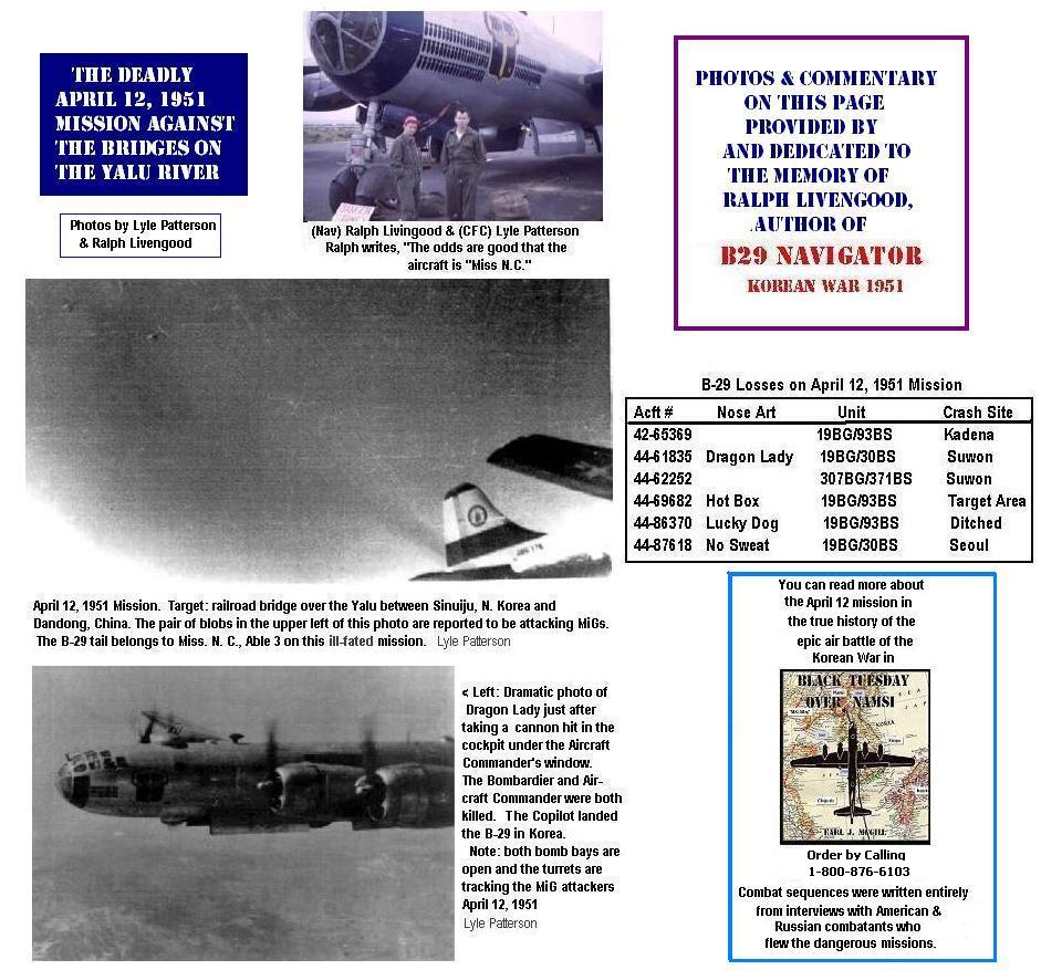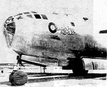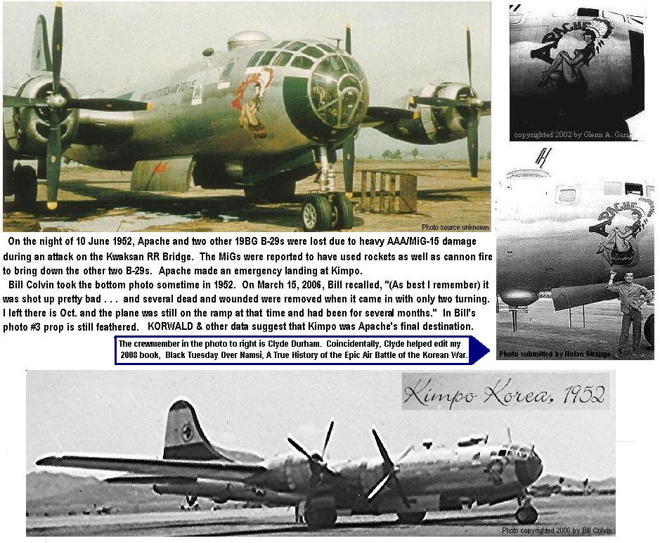 Apache [1902] 19BG-28BS: Although KORWALD lists this tail number as unknown, a crewmember who was flying his last mission wrote that Apache was severely damaged by AAA and MiG cannon fire while bombing the Kwakson RR Bridge on 10 June 1952.  This was the same night that two other B-29s, Hot to Go and Miss Jackie the Rebel were shot down over the same target. In March 2006 Bill Colvin verified (with photo) that Apache made it to Kimpo (K-14) with wounded aboard and was, in fact, the B-29 reported, sans tail number (see KORWALD report). Bill’s email & photo finally brought all of the pieces of the puzzle together.