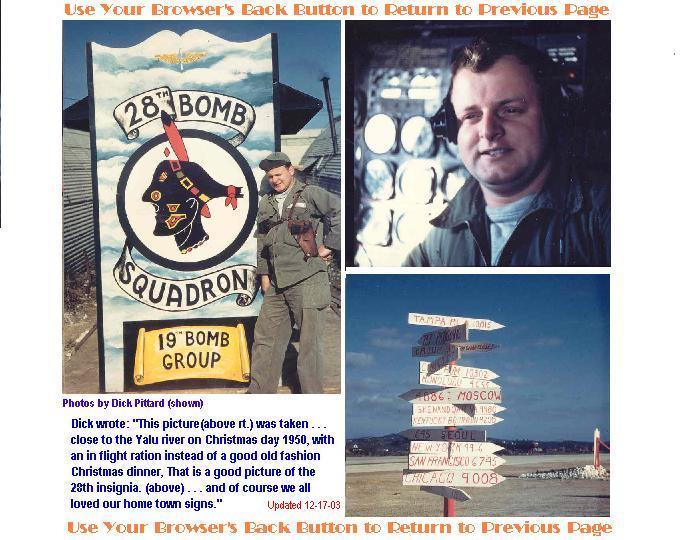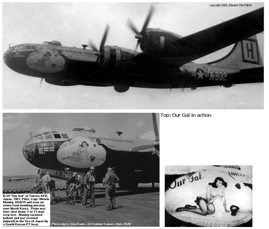 South Sea Sinner [3971] 19BG-28BS: When the Korean War broke out, Dick Pittard was the flight engineer on Lou Mallory’s crew, stationed on Guam.  They flew Sinner to Kadena and subsequently on 59 combat missions—about twenty more than the average number later in the war. Dick’s was the first crew to rotate to the ZI (Zone of Interior is military jargon for “United States”). You can see Dick’s name under the engineer’s window in the large photo.  Donald "Pete" Petrovich was a left gunner on Sinner.  This nose art was one of the most artistically rendered and would surely be a hit in any art exhibition for combat weary troops.  Sinner has also been immortalized in the hobby model airplane industry.  To view & review Aeromaster’s beautiful 28BS decals, including Sinner’s nose art, click here.