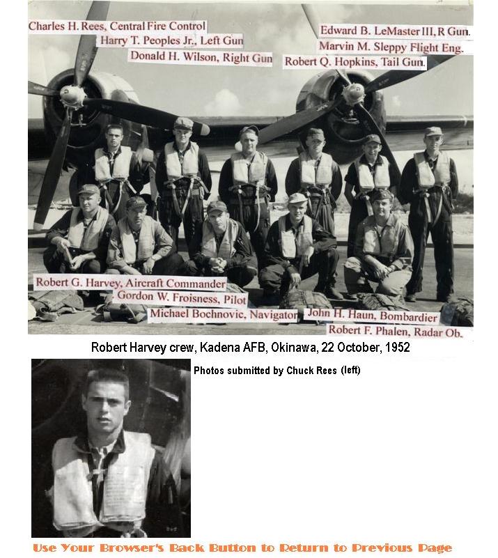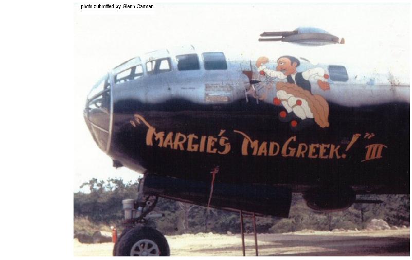 Wrights Delight’s, They Chosén Flew [6392] 98BG-345 BS: (Transferred form the 307th to the 98BG.)  My research turned up several variations, but the photo proves this is the correct name, including the accent mark above letter e in Chosén.  To begin with, my guess is that the crew commander’s name was Wright.  But “Delight’s” suggests there was more to it, perhaps referring to the Wright Brothers, who would be delighted with this crew’s performance, as well as the crew’s “delight’s” (possessive).  My assumption that “they” might have provided air support at “Frozen Chosin” was corrected by Joe Savko, who pointed out that Chosen (without the accent mark) means “Korea” in Japanese.  Like so many B-29s on this list, Wrights Delight’s was lost.  On November 19, 1952 while bombing a NK supply dump at Sonchon, it was damaged by MiG cannon fire.  As the 3rd flare was dropped, 20 search lights locked on the B-29.   Two minutes later, four bursts of MiG cannon fire hit #2 & #3 engines, setting them on fire.  Four parachutes were sighted at different inland locations and a flight of F-51s discovered a parachute hanging in a tree.  Wright's Delight crashed half a mile north of Cho-do Island.  Only two crewmembers survived. To read the chronological history of Wrights Delight’s, click here.
