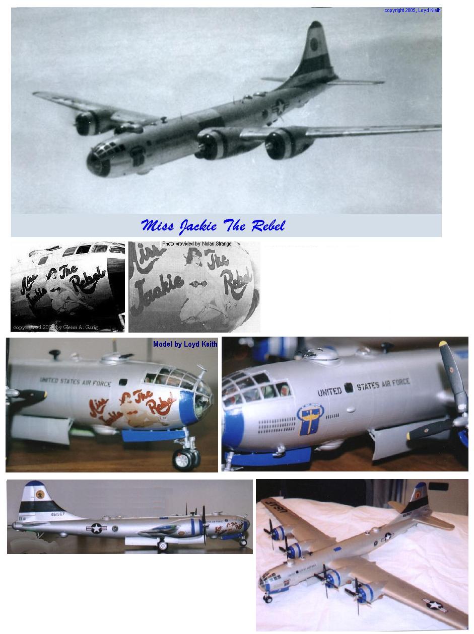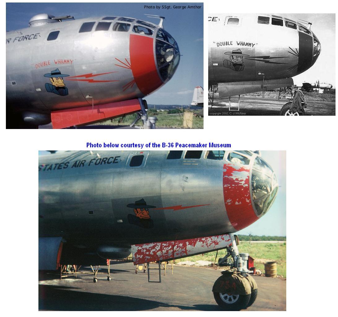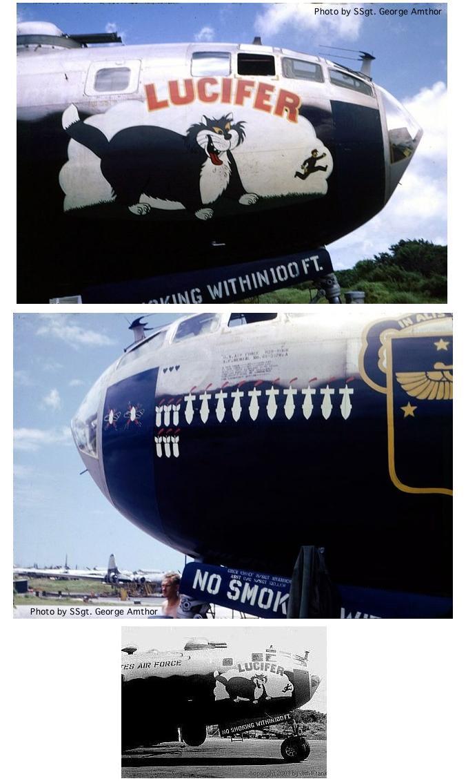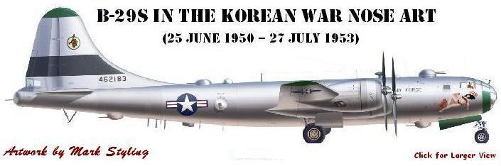 Raz 'N Hell [1535] 19BG-28BS: The only B-29s on this list accounted for and still looking good—thanks to Kim Comeau and the restoration crew @ the Castle Air Museum (Merced, CA).  Kim was instrumental in the restoration of the nose art, and wrote that Khaki is the name of the Indian warrior head displayed by the 28th squadron.  Tim Terrell shared the following: The pilot, Ed Bradfield of Rockville, IN. told Tim that Raz’N Hell was likely the only B-29 to shoot-out one of it's own engines during the Korean War. He said maintenance forgot to replace the barrel-stops on one of the top-turrets. During the mission, they were to expend ammunition before returning. One of the crew (not a gunner) wanted to shoot the guns.  He swiveled the turret and promptly shot-out their #2 engine when the guns depressed farther than they should have, due to the missing stops.  Tim later modeled Raz 'N Hell with it's #2 engine shot-up and prop feathered, wheels down and preparing to land after this mission.  Tim also provided this: “On the left-side nose of B-29A Raz'N Hell are rows of colored bombs representing each mission flown.  Most are black--no action. Some are Red-- encountered MIGs or flak over target. One bomb was painted GREEN--perhaps the mission where they shot-out their own #2 engine?”  The photo of the left side of the Castle Raz N' Hell restoration presented a mystery that was solved by Bob Mann.  The serial number stenciled in the aircraft data block is 44-70064, which is not the correct serial number for Raz N' Hell.  Bob wrote: "I show 70064 as being a WW II 19BG plane - Black Square M 39 . . . the art on the right side [of] Raz'n Hell was applied from photos of the original art at the Castle Air Museum.  That airplane is a composite of parts from four planes and it is quite possible that the nose is indeed 44-70064."
