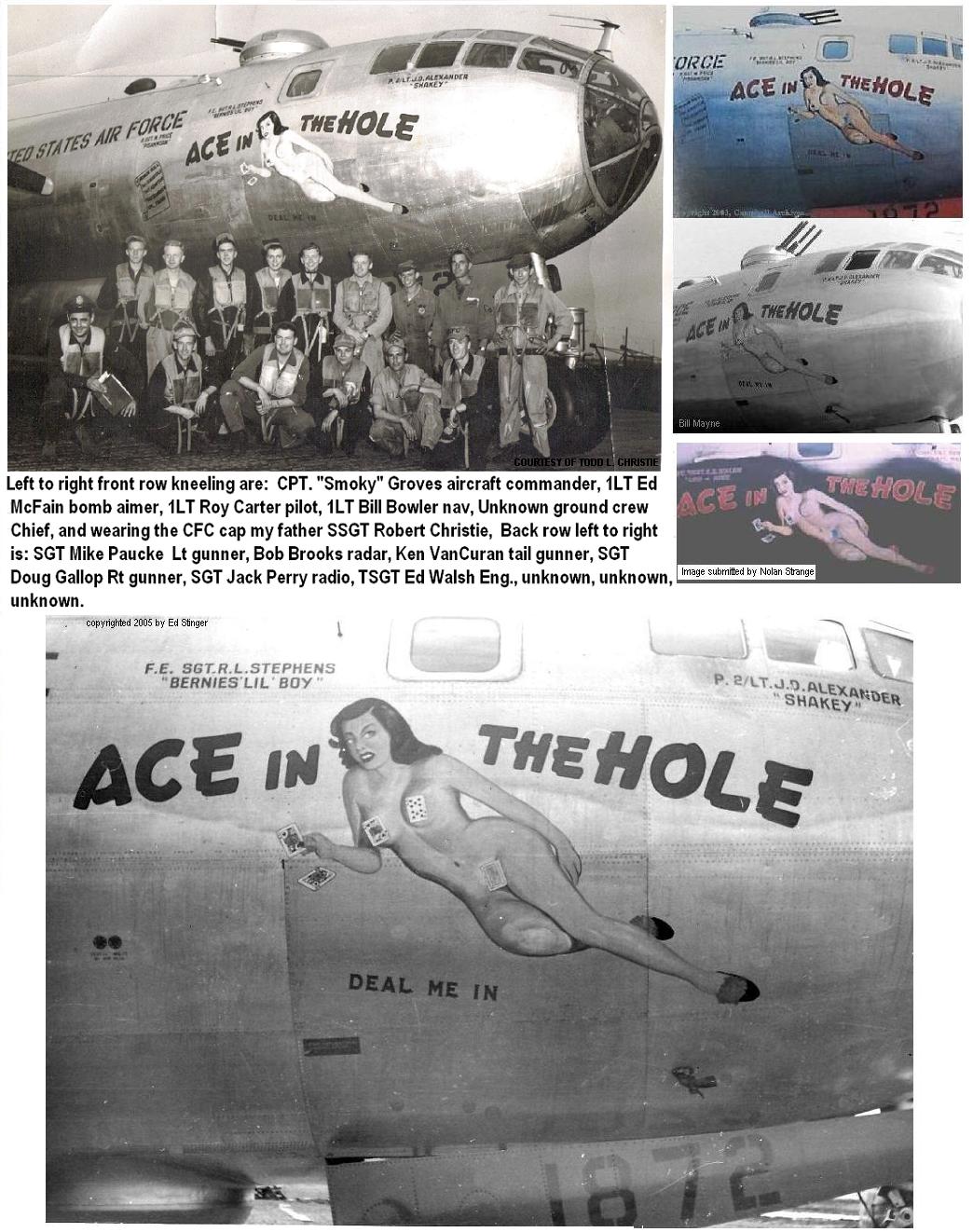 Ace in the Hole, Deal Me In [1872] 98BG: This new crew photo was submitted by Todd Christie, who wrote, "My father was the CFC on Ace in the Hole and TDY Widow II based out of Yokota AF in Japan in 1951-52... "  In the photo taken by Ed Stringer the cards can be seen clearly.  As all good poker players will attest, an ace in the hole is a powerful card.  The connotation is that this airplane is the 98BG’s powerful hole card.  So where is the ace?  (We won’t go there.)