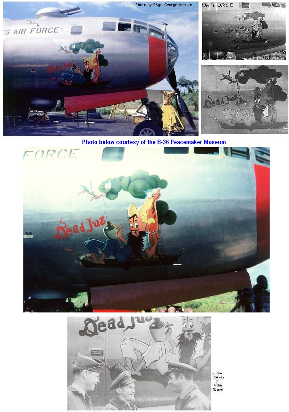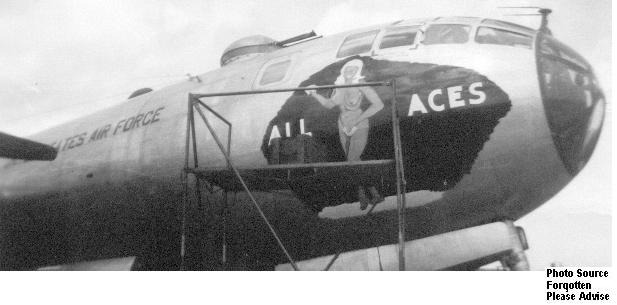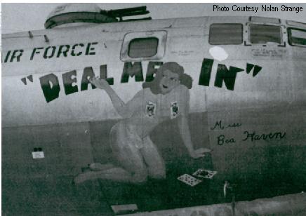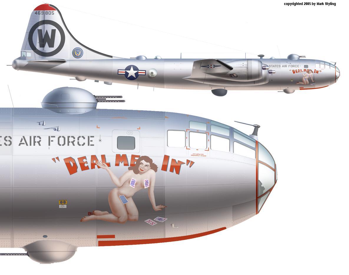 Deal Me In [9805] 92BG-325BS: Reportedly, there were two Deal Me In nose art pictures.  Jim Peters writes, "This was a 92nd BG B-29, 325th BS and originally was to be named Ace In the Hole.  The crew chief was a M/Sgt Milstead. The reason for not naming the B-29 Ace In The Hole was it was considered too racy at the time."  Click to view Mark Styling’s beautiful painting of Deal Me In.