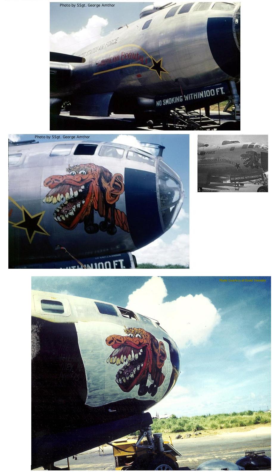 American Beauty [7661] 19BG-30BS: (circa 11/51): No relationship to the academy award-winning movie of the same name.  Most nose art reflects the keen sense of humor of the men who crewed the airplanes.  Much of it ironic.  All of it metaphoric. What you see on the nose of the B-29 is superficial.  There was always another meaning.  The American beauty on the nose of this B-29 is, of course, just the opposite.  Originally Lena the Hyena, American Beauty was the creation of Basil Wolverton while competing in an Al Capp contest to depict the world’s ugliest woman. Records indicate that this is the same tail number as Night Mare, UGG-LY  and the Koza Kid,—however, the Kid had more than one nose painting.  Bob Mann points out that the “Beauty” in the photo retains the WWII 58BW/468BG "Shooting Star" art.