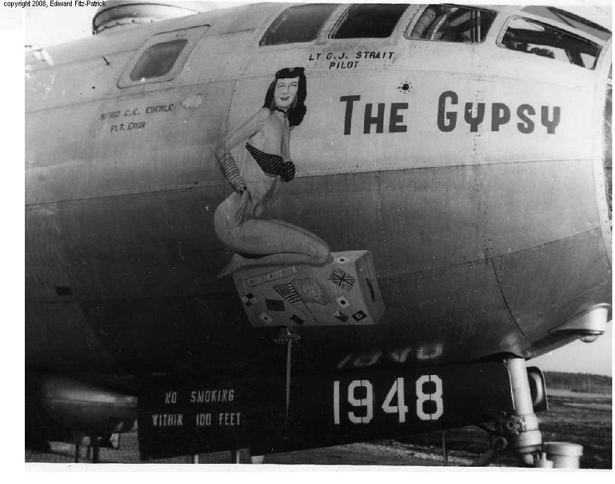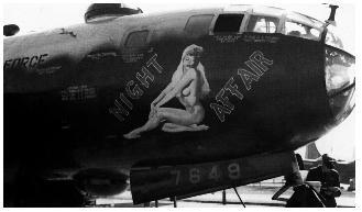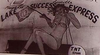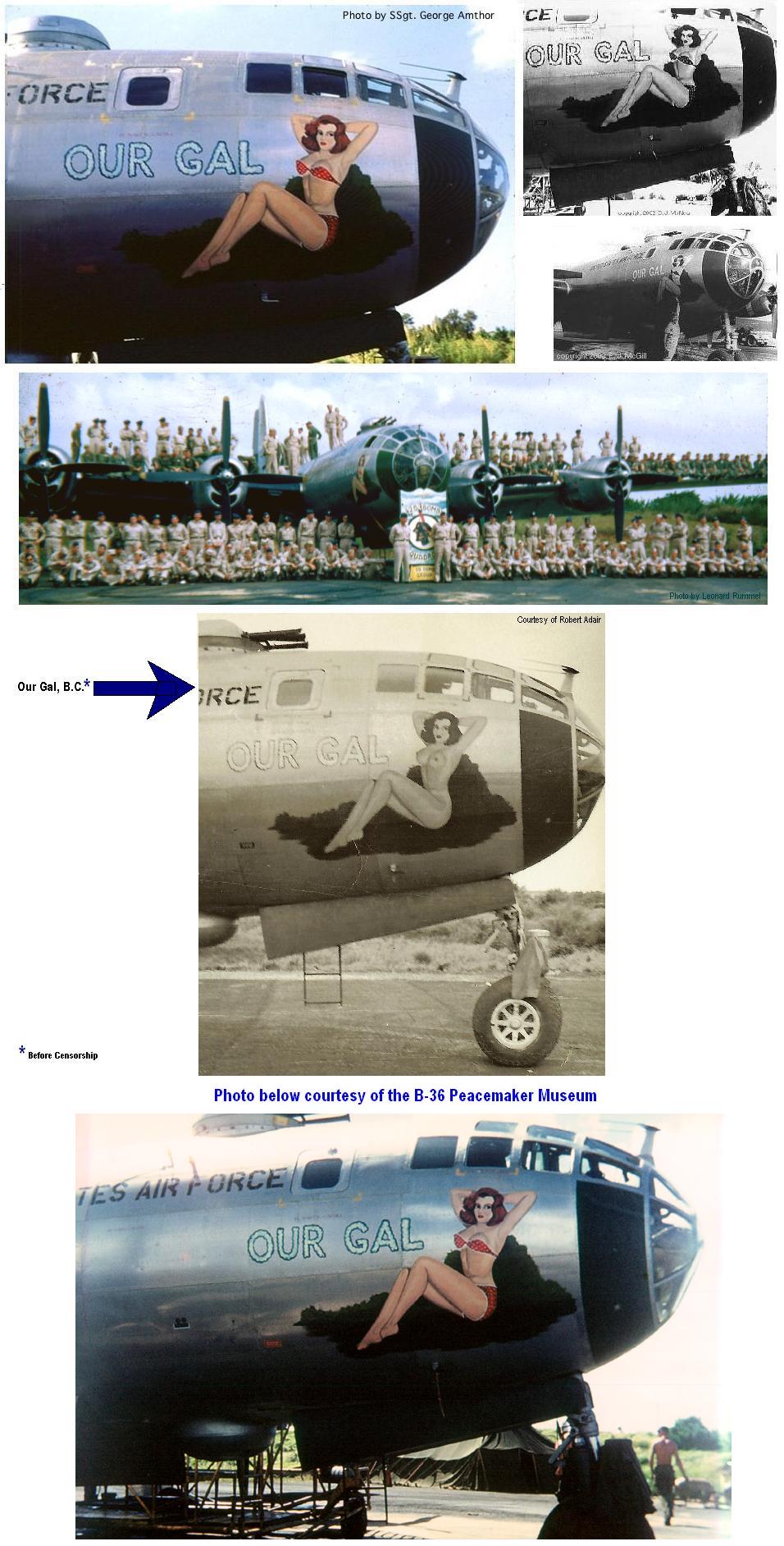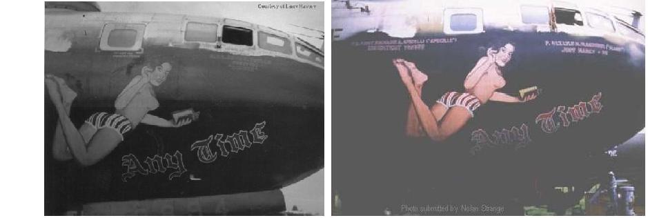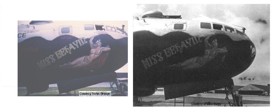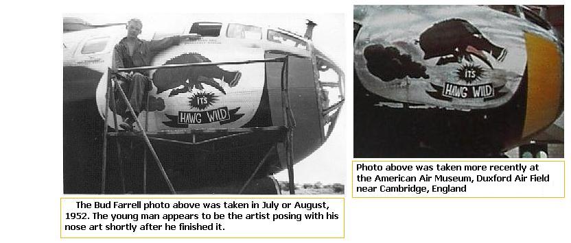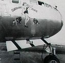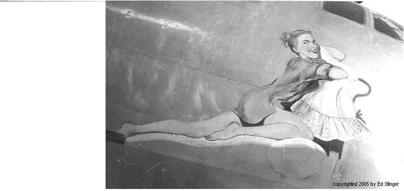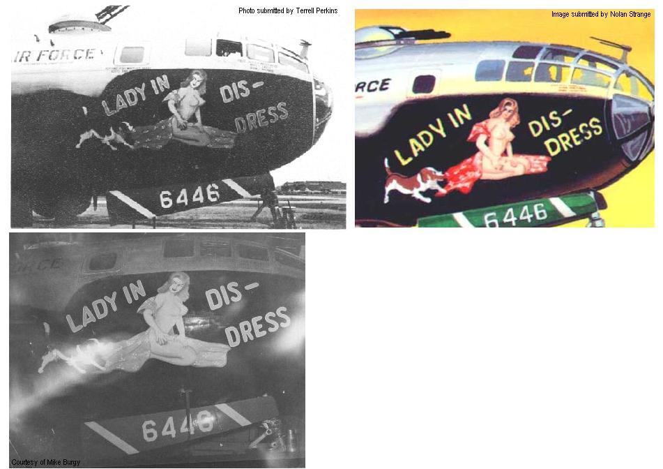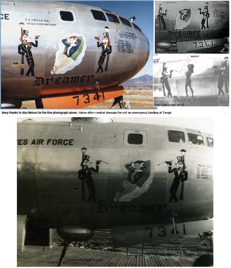 Dreamer [7341] 98BG-343BS: The large photo, reprinted from Max D. Nelson’s terrific web site, is probably the best quality nose art photo on my list.  On October 24 1951, the day after Black Tuesday, Dreamer was severely battle damaged & Max’s crew was forced to make an emergency landing at Taegu (photo).  Max remembers, "To the best of my knowledge, 7341 never flew again.  The most serious damage, which wasn't apparent in the photos, was a 37mm shell embedded in the main spar of the right wing, which did not explode (fortunately for us).  There was also a 21mm un-exploded shell in one of the main gear tires. I'll always remember when Dave (A/C) rang the warning bell to prepare to bail-out. I grabbed my camera and forgot my chest-pack chute. Luckily the flames from #4 blew out and we made it to Taegu."   A pair of dapper wolves, in formal attire, lean against lamp posts & tip their swagger sticks (remember those?) toward the lovelies in the center.  The right side may be an earlier version, before the censors moved in and made the crews dress their dreams.  The lady on the left, however dressed, is still a dream resting on a cloud.  See also Elsie: the Armored Cow.