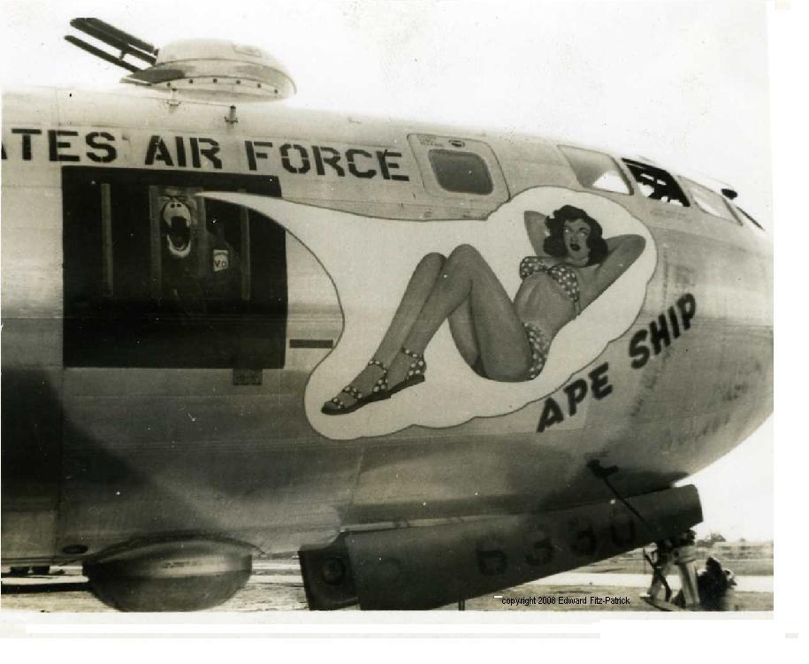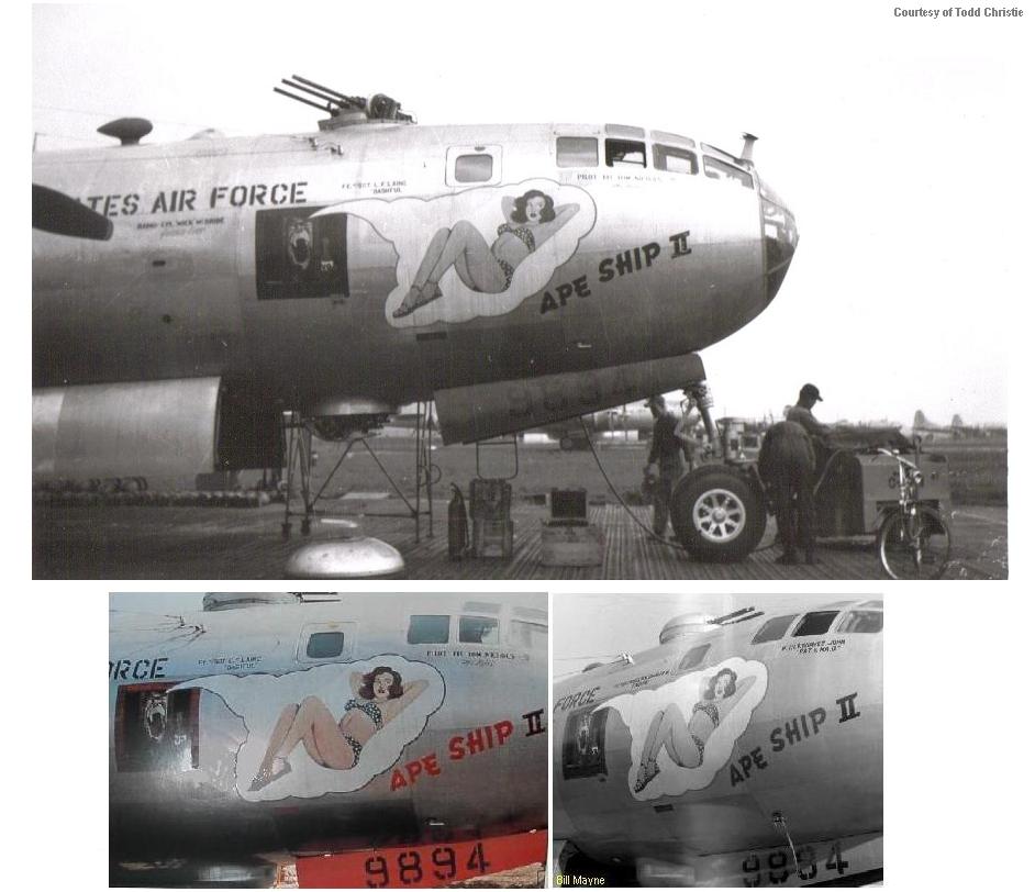 Ape Ship II [9894] 98BG-343BS: A virtual duplicate of Ape Ship.  The assigned crew probably was not flying Ape Ship when it was shot down and duplicated their original nose art on their replacement B-29.   The SYT floats in a cloud of—what, memory, imagination or yearning?