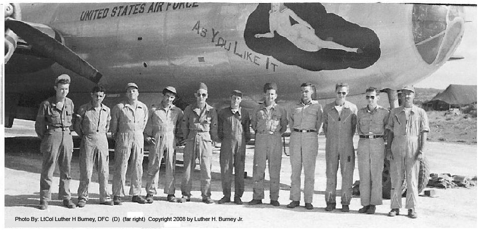 As You Like It [7277] 22BG-2BS: Luther Burney wrote, "The plane was named in March 1950 by the pilot, Capt.Luther H. Burney DFC, who was an English major in college before WWII. It was named after "As You Like It" a pastoral comedy by William Shakespeare based on the novel Rosalynde by Thomas Lodge, believed to have been written in 1599 or early 1600. It features one of Shakespeare's most famous and oft-quoted lines, "All the world's a stage."  The Circle E B-29 flew 28 combat missions from Okinawa to Korea from Mar.-Nov. 1950. As You Like It was reclaimed (salvaged) at McClellan AFB, CA. 7-14-1954.