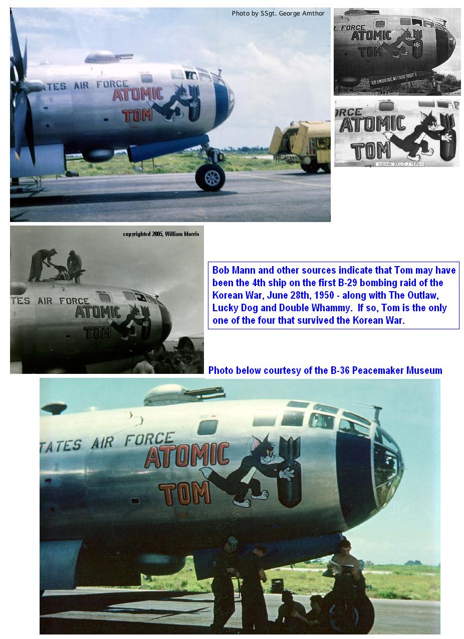 Atomic Tom [1682] 19BG-30BS: (circa 11/51): The cat dropping the bomb is Tom from the Tom and Jerry cartoon series.   Judging from Tom's expression, he hopes the bomb drops on Jerry.  Since no atomic bombs were carried or even available to B-29 units in the Korean War, the name is somewhat misleading. Bob Mann & one other source indicate that Tom may have been the 4th ship on the first raid June 28th - along with The Outlaw, Lucky Dog and Double Whammy.  If so, Tom is the only one of the four that survived the Korean War.  Apparently there were two copies of Atomic Tom. Serial number has not been verified.  To view & review Aeromaster’s beautiful 19BG decals, including Tom’s nose art, click here for ModelingMadness.com.