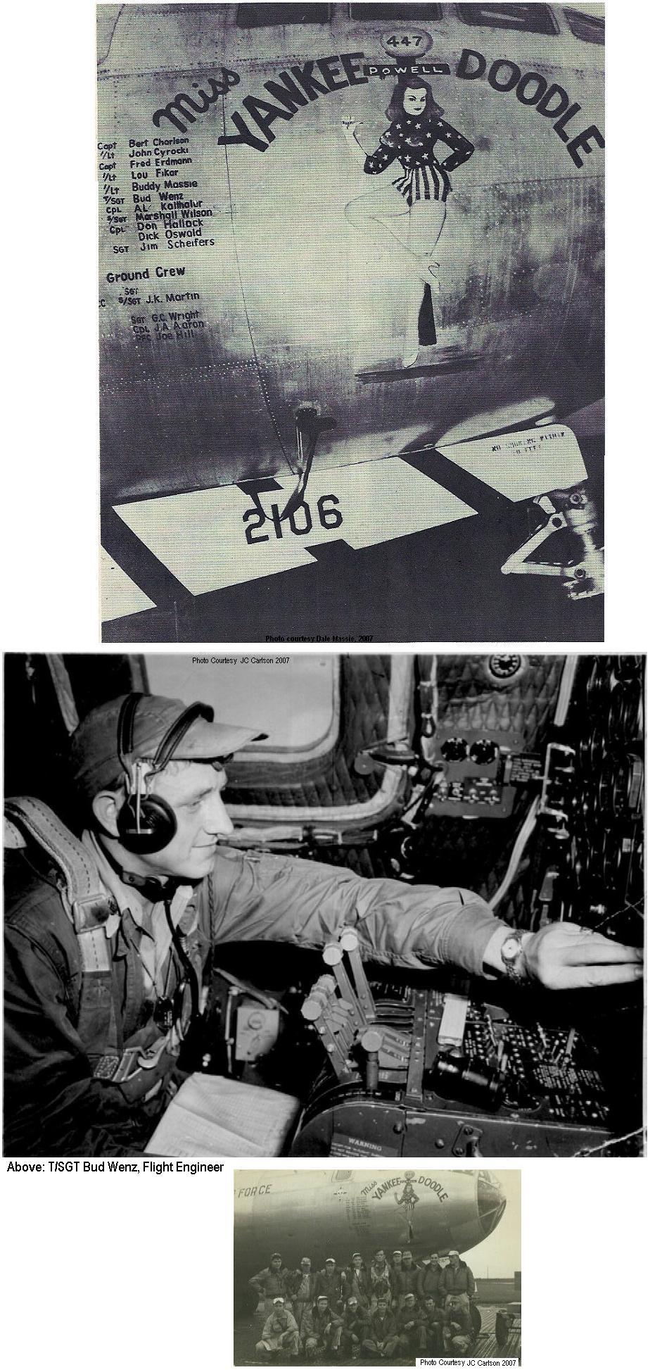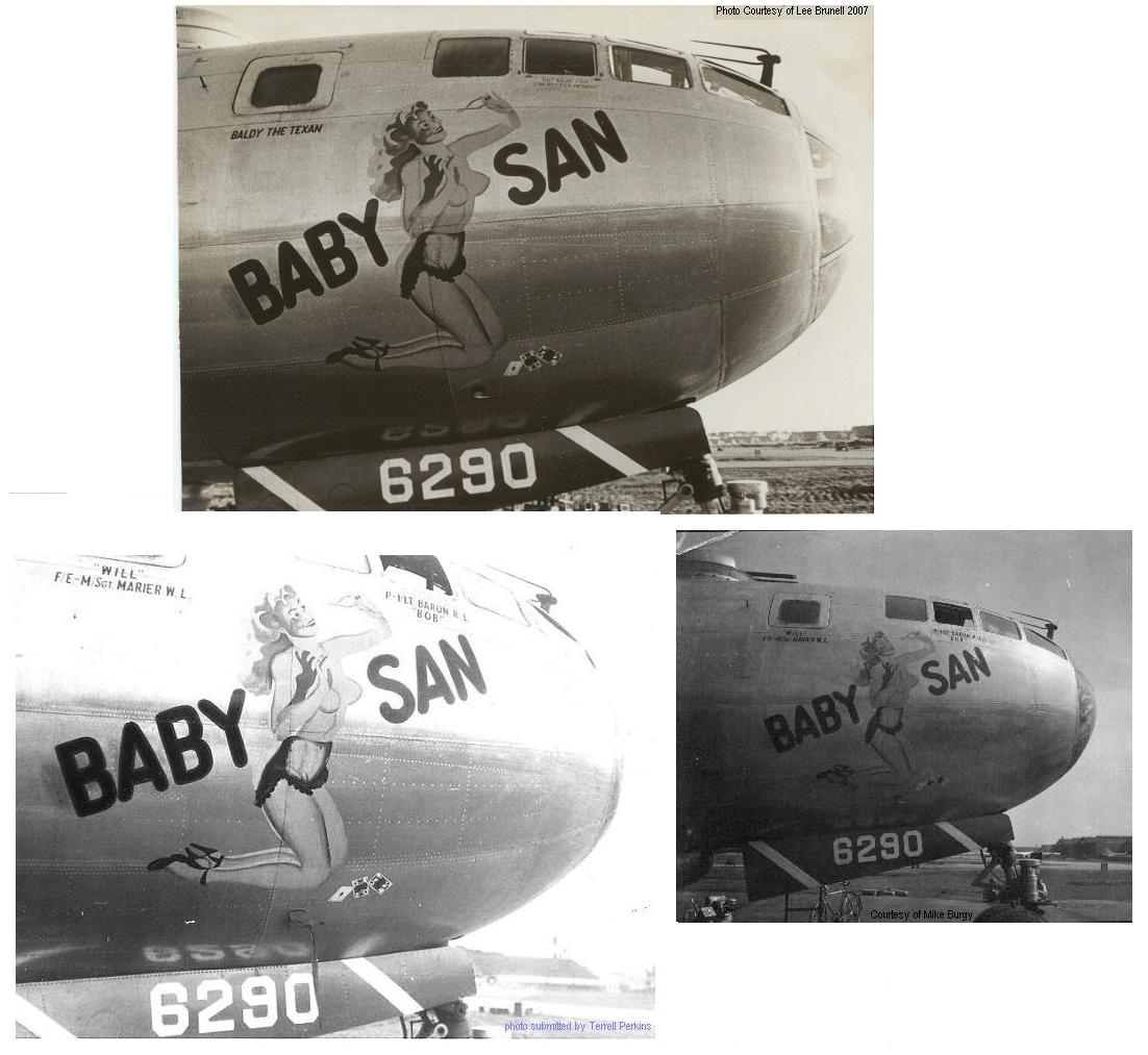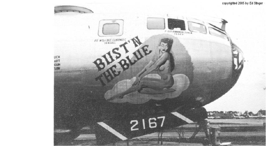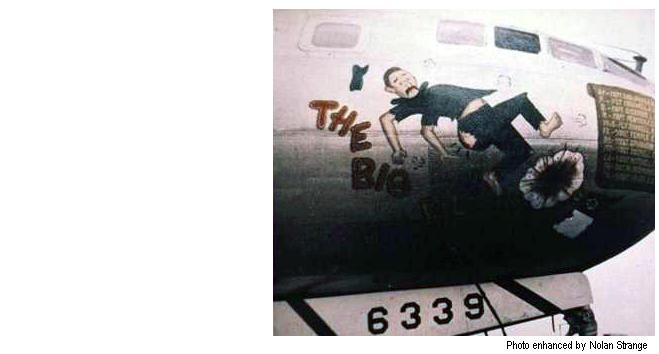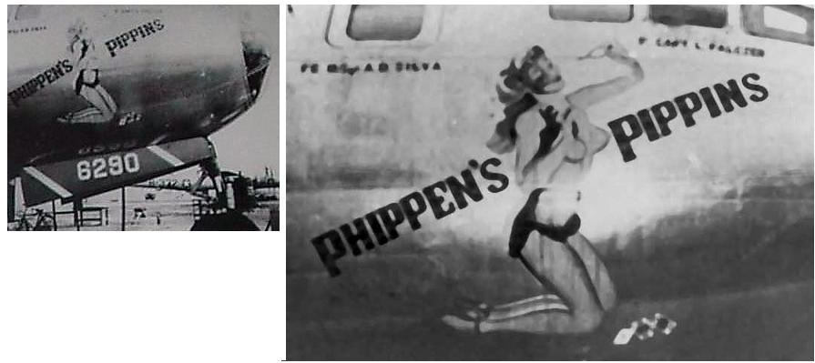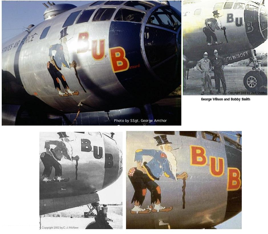 Capt. Sam and Ten "Scent's" [6359] 19BG-93BS: Perhaps the most ambitious of all nose art. Eleven men trained and flew combat together as a crew.  Scent's is a play on cents but the significance is not clear. Carl Beitz's father, Tony, flew as a gunner on Capt. Sam and would appreciate hearing from others. Full serial number has not been verified.