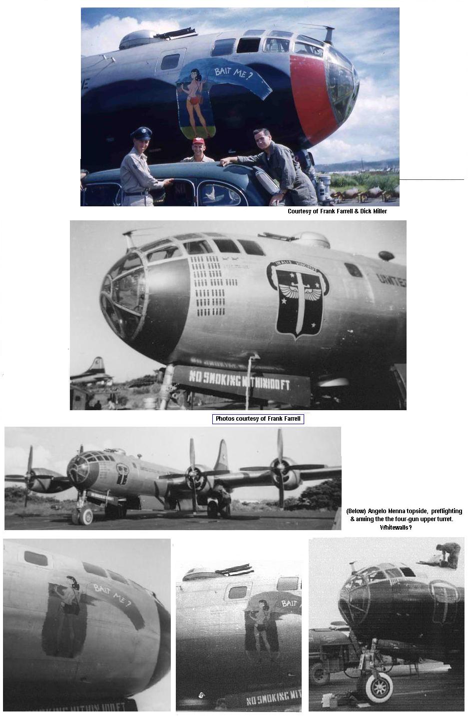 Bait Me? [9802] 19BG-93BS: The SWT on Bait Me? appears to be left-handed and fishing in high heels.  Bud Farrell wrote, (Bait Me) was the only B-29 on Okinawa with white wall tires." On the night of 9/12/52, on the way to Suiho, she iced up and crashed 21 mi SW of Kangnung, South Korea.  Eleven of the twelve-man crew perished.  Only Al Gerato managed to bail out, a scant 500' above the ground.