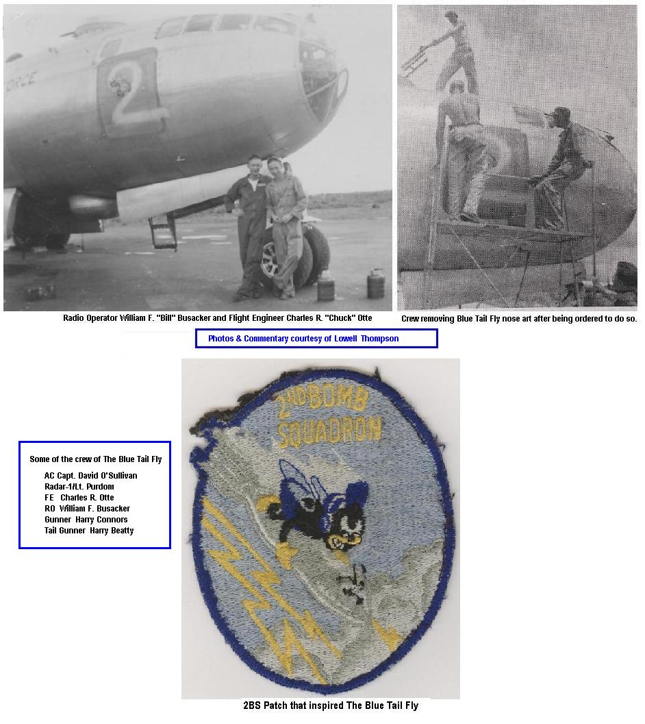Blue Tail Fly, The [1693] 22BG-2BS:  Ernest Lloyd Thompson, a crew gunner, arrived at Kadena on July 9, 1950.  He flew all 29 of his missions in The Blue Tail Fly, and wrote, "... #693 took us there from California (and) flew 29 missions without serious malfunction. (Then) 693 was taken from us and killed the next crew that flew her."  His son, Lowell, added: "The crew's one hour test hop in 693 on 23 October would be their last flight in this ship before turning it over to another unit.  This airplane was painted with the nose art of a blue tailed fly making a numeral 2 with a smoke trail inside of what I think was a light blue rounded-corner rectangle on the right nose.  They called her "The Blue Tail Fly" though those words are not visible in the photos I've seen…Somewhere along the way his crew was informed that the numeral 2 on the nose art had to go because it identified the 2BS specifically and that was against AF regs.  The crew had to remove the entire nose art scheme and so renamed the ship ZE TAINT! with an extra large exclamation mark.