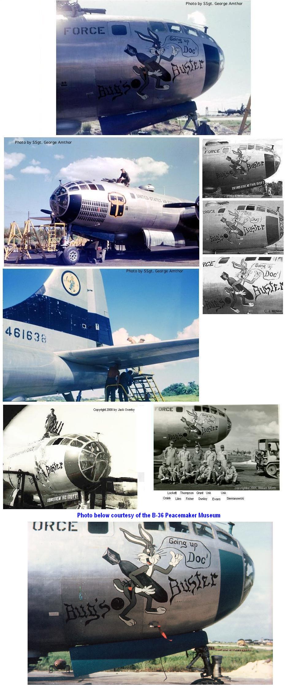 Bugs (Ball) Buster [1638] 19BG-30BS: (circa 11/51) Note the small ball behind Bugs BunnyHe also carries a carrot in his hip holster.  It’s possible that the different Bugs are not on the same aircraft.  The cartoon balloon has Bugs saying, “Going Up, Doc,” instead of the standard, “What’s Up, Doc?”