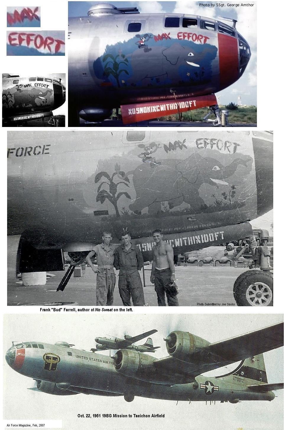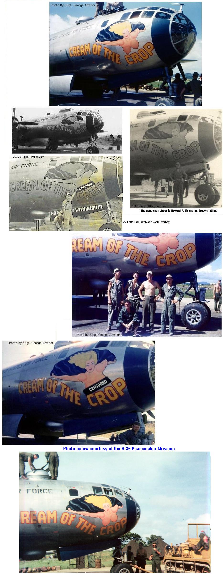 Cream of the Crop [1656] 19BG-30BS:  Not much to argue about here.  Apparently the “brass” objected to Cream's nipples and the crew responded by literally “censoring” their nose art.  See Cream of the Crop in action by clicking here. The day before Black Tuesday, 10/22/1951, Cream of the Crop, commanded by Capt Lyle B. Bordeaux, was shot down by a MiG-15 piloted by Lt. Col. Aleksandr P. Smorchkov.  The crew bailed out over the Yellow sea and was rescued by the 3rd Air Rescue Squadron from P-Y-do. [Don Birch]