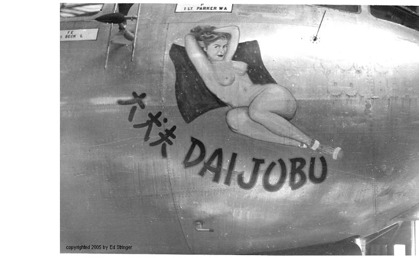 Daijobu [1815] 91SRW-91SRS  This appears to be a misspelling of daijoubu, which means “No Problem.”  Daijobu” means “Are you all right?” as in “Have you got all your marbles?” Mike Sawyer supplied some other possible meanings, but to anyone who was there at the time this one means, "No problem," as in "No problem, GI," a well-worn phrase used by SWTs anxious to practice their trade.  Antenna array suggests some sort of recon or spook model B-29.  Look closely and you can see the dim outline of previous nose art.  See also Moon’s Moonbeam and Sun Bonnet King.