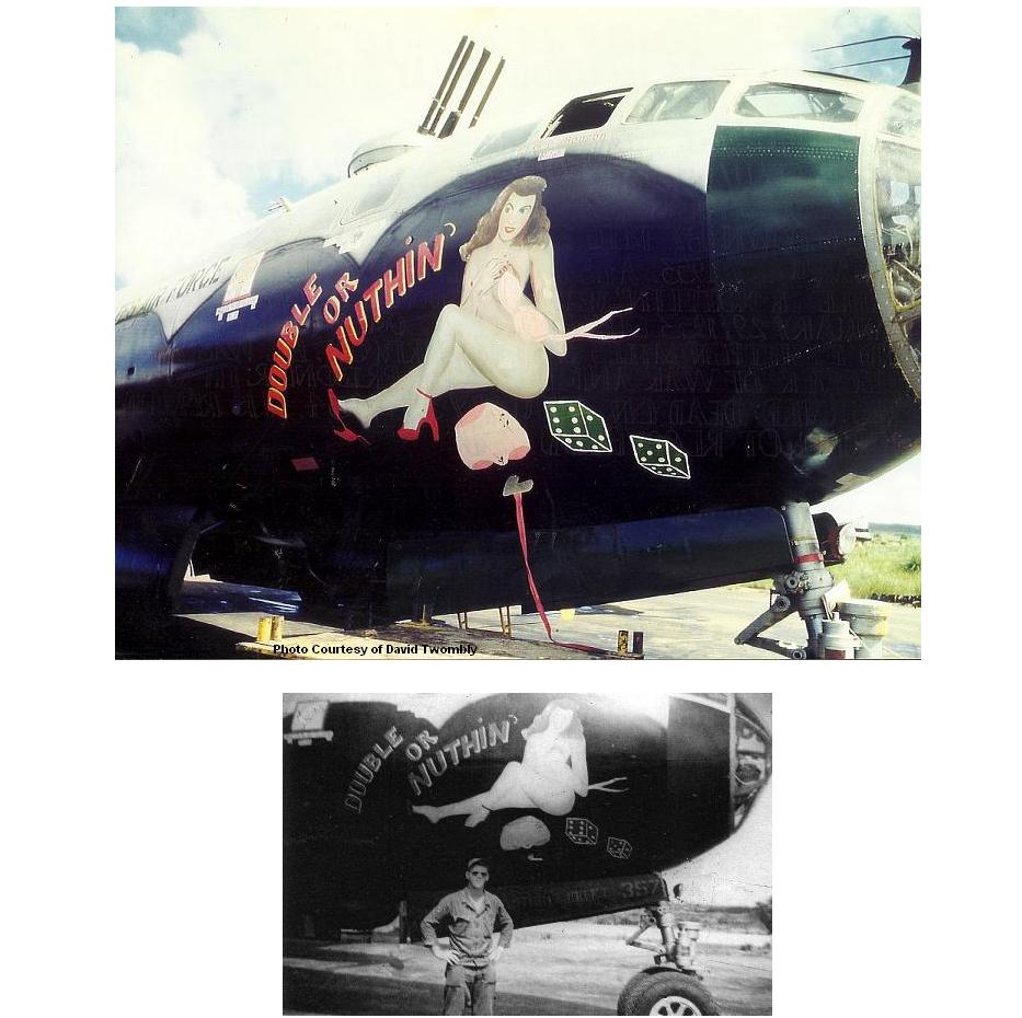 Double Or Nothin[5357] 19BG-28BS: Dice was a popular game to see who paid the bar bill.  The loser would often go for double (two drinks or twice the ante) or pay nothing—depending on who rolled the highest number. In this illustration the SYT appears to be down to “nothing,” so obviously the “double” means something else is at stake.  Originally Shady Lady when assigned to the 98th, Double or Nothing was shot down by MiGs on  01/29/1953 near  Pyongyang.