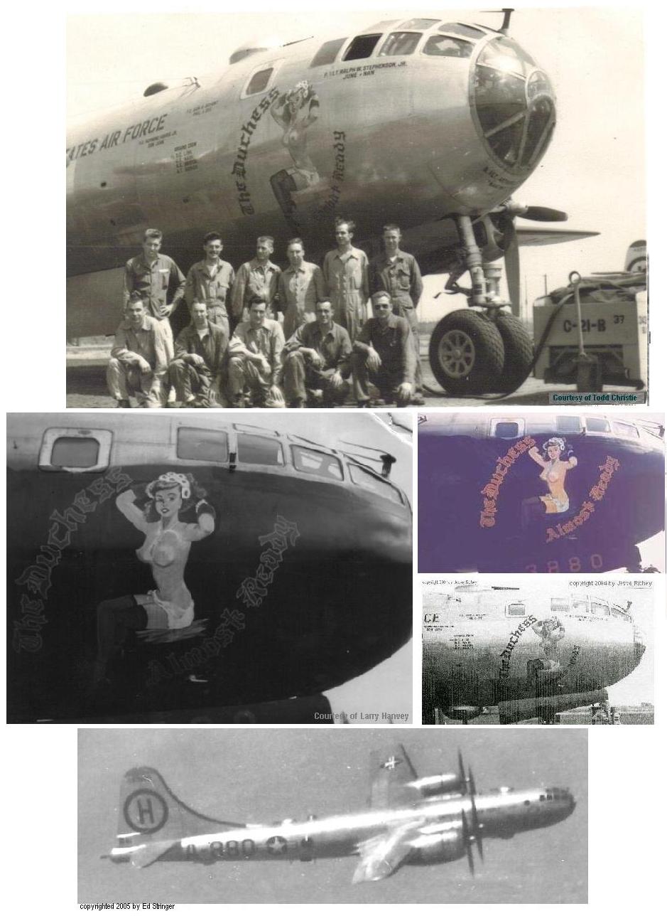 Duchess-Almost Ready, The [3880] 98BG: There are two different “sub” names for the Duchess. Gerry Keneske, right gunner on 3880 from March to October, 1952, offered the following: "Capt. Melvin N. Duke was the aircraft commander . . . who gave it the name The Duchess, claiming that every Duke needed a Duchess. The crew came up with the subtitle 'Combat Ready.' Aircraft 3880 and our crew arrived about the same time at Yokota AFB, Japan. We flew most of our 26 missions in our lady and although we saw our share of the rockets red glare, we never had a scratch. Our closest call was the loss of two engines (mechanical) over a target that resulted in a near crash on approach (Taegu, Korea) due to ground control's lack of familiarity with flight characteristics of the B-29. Capt. Duke was a veteran of WW II flying 77 missions over 'The Hump.'  In a phone conversation with him fifty year later, he remarked, 'You know, I could land a plane on two engines better than I can now navigate down the hall to take a leak.'