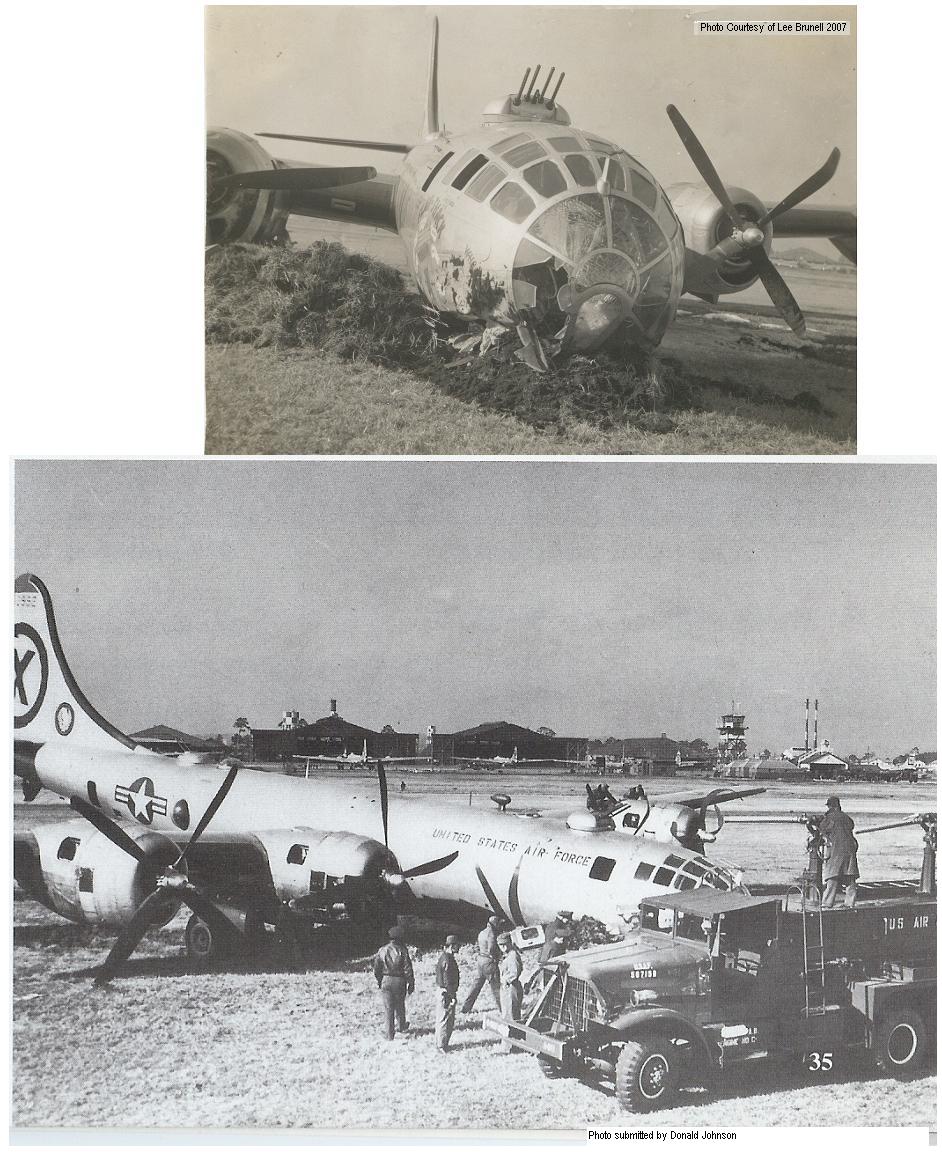 Flak Shack [3992] 91SRW-91SRS: Donald Johnson, stationed at Yokota AFB, Japan from 1951 thru 1954, sent the following: "[Flak Shack] aborted takeoff from Yokota when one engine failed to develop the required power and ran off the runway. The aircraft was totaled and one crewmember injured.  Ted Moran, the tail gunner, shattered his ankle when he jumped off the wing.  He was hospitalized at Johnson AB, not far from Yokota.  Ted's crew and I visited him several times while he was there. Ted and his wife accompanied my wife and I on a trip to Hawaii about five years ago (2003). Ted has since passed on."  Don adds, "One AC told me that the B-29 was the "best "three-engine" aircraft" the USAF ever had.  Others have referred to the Wright engines as being the "Wrong" engines. {Webmaster's crash in The Outlaw was eerily similar.) Caption on the back of the Lee Brunell photo, reads "21 Jan 1952  Total Loss. Marked Official Air Force  Photograph APO 328 [Yokota]."  Evidence provided by Collin Smith indicates that Flak Shack was a later version of Where Next?  (Ed. Note: Eyewitness reports differ from various published accounts that claim Flak  Shack was hit by flak in March 1952 while over the Yalu and crash landed.)