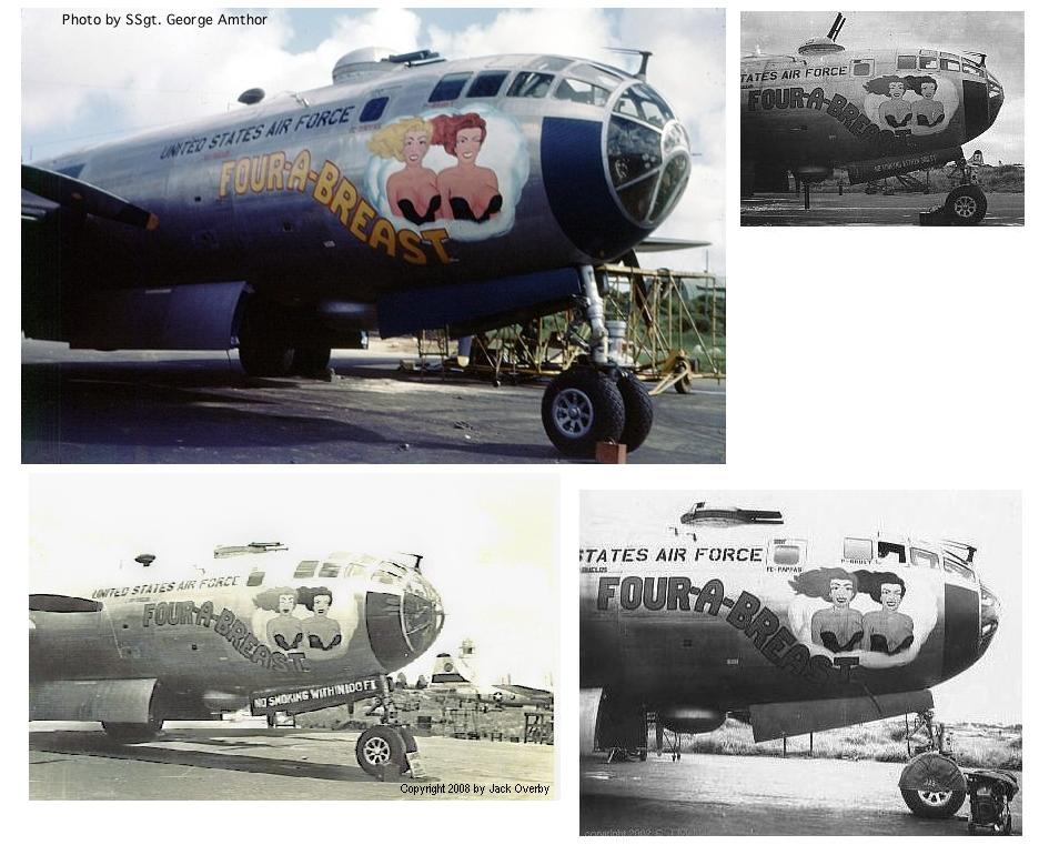 Four-A-Breast [6323] 19BG-28BS: (circa 11/51): The bomber flew120 missions and was credited with one Mig.  Glenn Garig and his crew flew Four-A-Breast back to the states.  This nose art inspired our crew to name our plane, "Clusterphobia."  Alas, “Clusterphobia” was never painted and later became Apache.