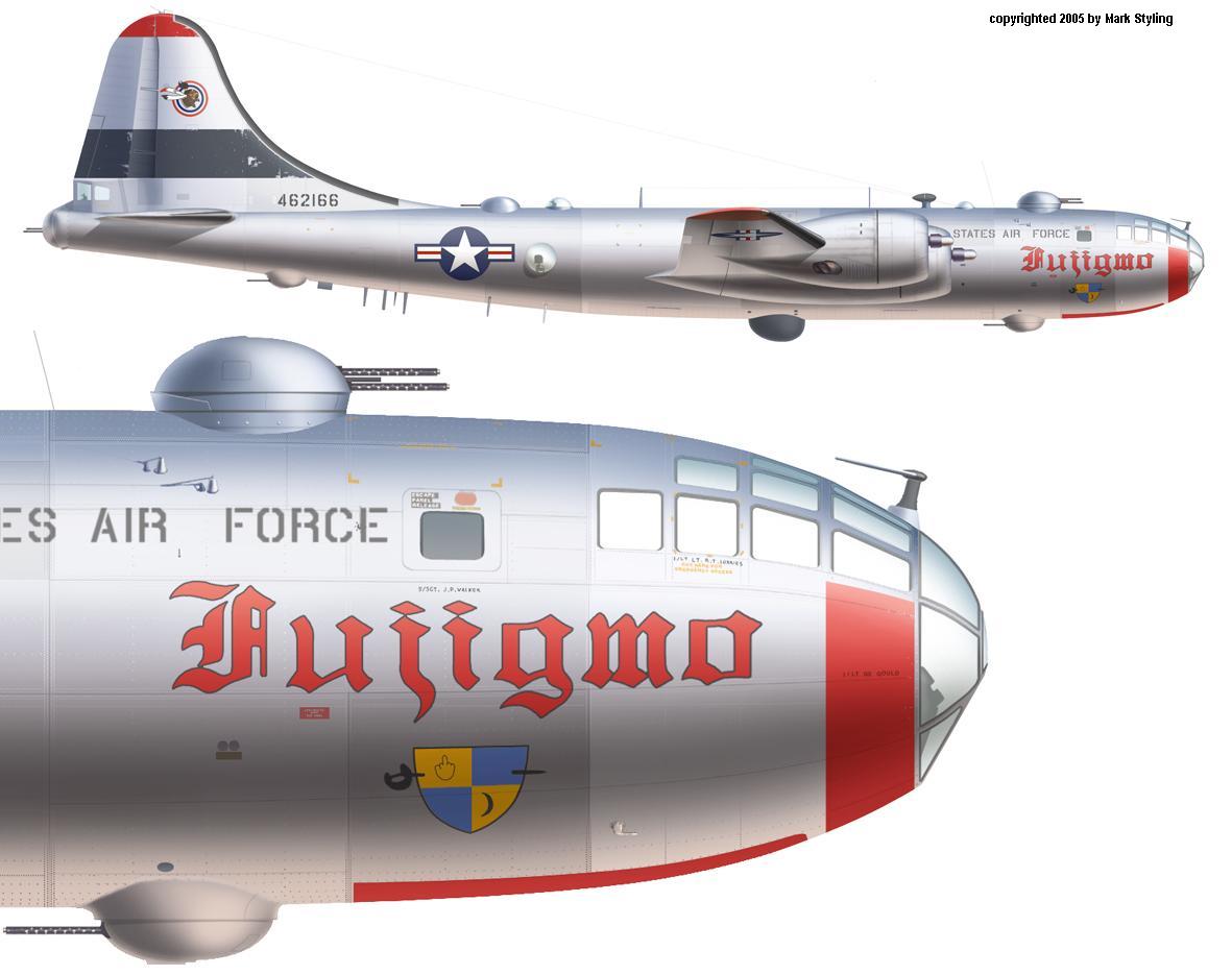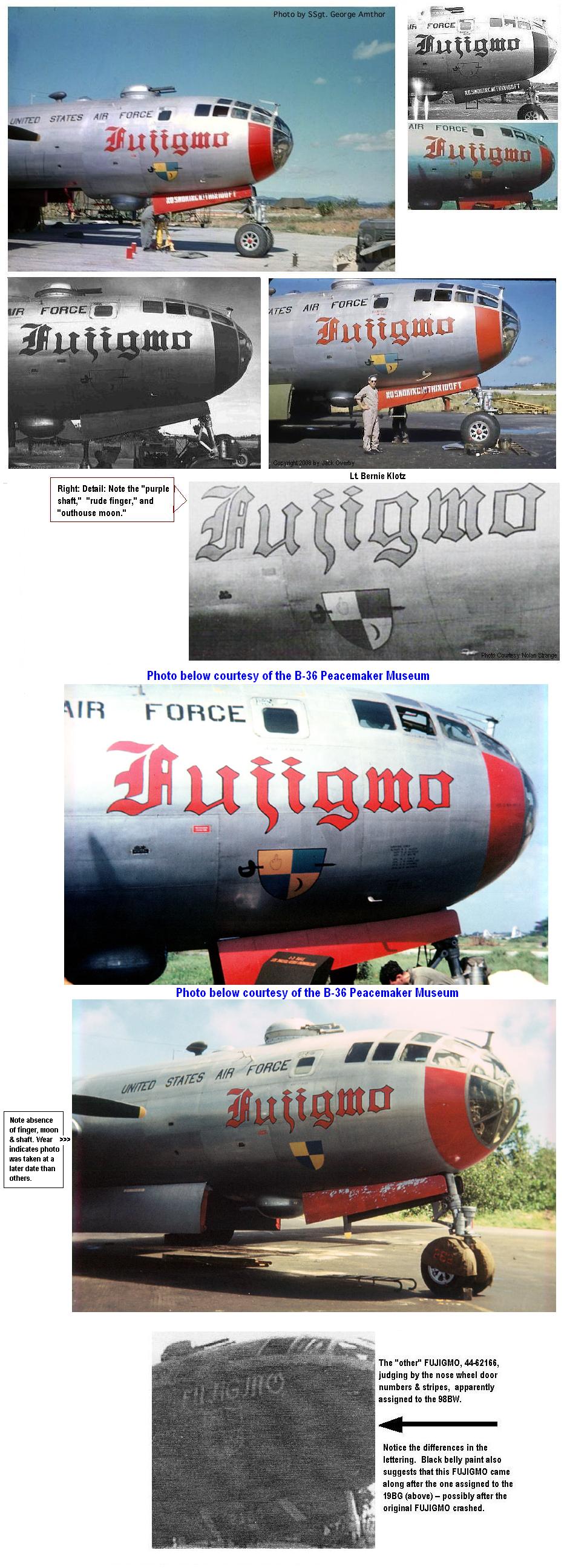 FUJIGMO [UNK] 19BG-93BS: (circa 11/51): Whenever a visiting dignitary asked for the meaning of "FUJIGMO," the answer was usually that it was a Japanese word like "Bansai!"  It does look impressive in a sort of classic Oriental-Gothic print, with a coat-of-arms shield below, indicative of heraldry, honor, and all that knighthood stuff.  Sword, raised fist, and moon symbol.  Ah, but look closer and you see--yes, the sword is a purple shaft; the fist raises a finger, and the half moon is (politely) an outhouse decoration! FUJIGMO equals: F--- yoU Jack, I Got My Orders.  FUJIGMO had engine trouble on a test flight and crashed.  Don Nicholas e-mailed:  “I watched FUJIGMO crash, while on duty as Tower Officer   As I recall … they shut down #1 engine inflight ... copilot was making the landing, came in high and hot, and AC took control too late. Got behind the power curve on three engines, and airplane did a slow banking turn into the weak side and cartwheeled in the infield. Luckily, there were survivors.  The faded photo of the 98th FUJIGMO is a rougher version of the 19BG nose art.  Click to view Mark Styling’s beautiful painting of FUJIGMO.