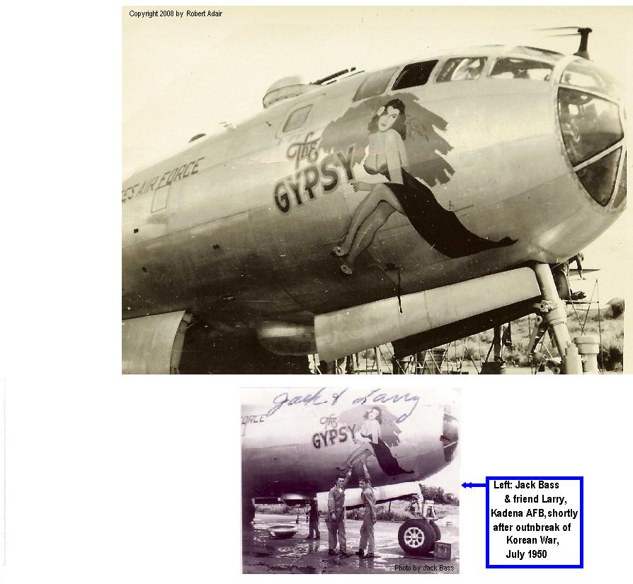 Sic’ Em [1809] 98BG:  Ed Stinger’s photo reveals the name of the copilot, Earl Anderson, one of my cadet classmates who also survived the forgotten war.  Notice the inscription that both pilots are on temporary duty from the Texas Air Force.  Bruce Bergman was told the following by his Uncle Vin:  Prior to the mission Sic’ Em was parked away from other group B-29s.  The crew boarded, but left the bomb bay doors open for 30 minutes before taxiing out and taking off.  After three hours, they opened the doors, left them open awhile, then returned to base. Much later, Bruce’s uncle learned they’d dropped off a spy while off the North Korean coast.