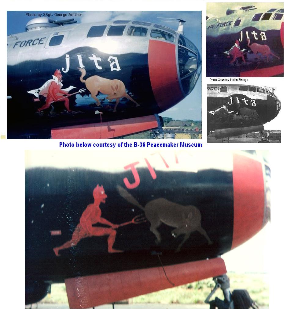 Persuade Her [6316] 19BG-28BS (circa 1950) Play on the word persuader.  Double (sometimes triple & more) meanings were par for nose art.  Jim Fair wrote, “ The AC was Rummel (and) I was right gunner. I also flew on the plane that carried the Tarzon bomb and was on the mission when Col Jennings went down.  We were trying to knock out a dam and the target was socked in.  The Colonel went below the clouds to find the target (and) may have iced up or been hit with ground fire.”  Jim also recalled, “On (another) mission we were hit by MiGs near the Yalu, landed at K2, a fighter base, and tore up the metal runway. While we were taxiing, some Colonel in a jeep was shaking his fist at us.  From K2 we went to Itazuke, and Rummel went to the Officers club, jumped up on a table and used some nasty words at the fighter pilots for not giving us cover.”  Click here to see Dick Pittard's great color photos of "Persuade Her" and the 28BS in action.