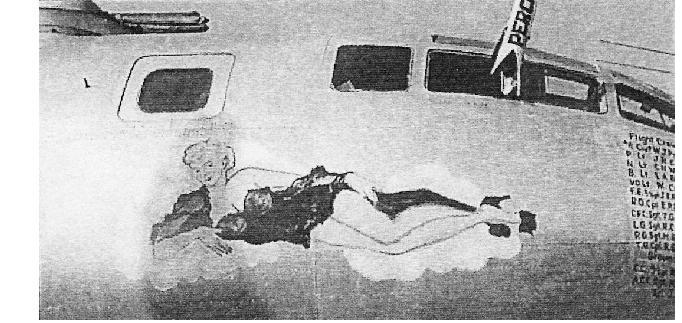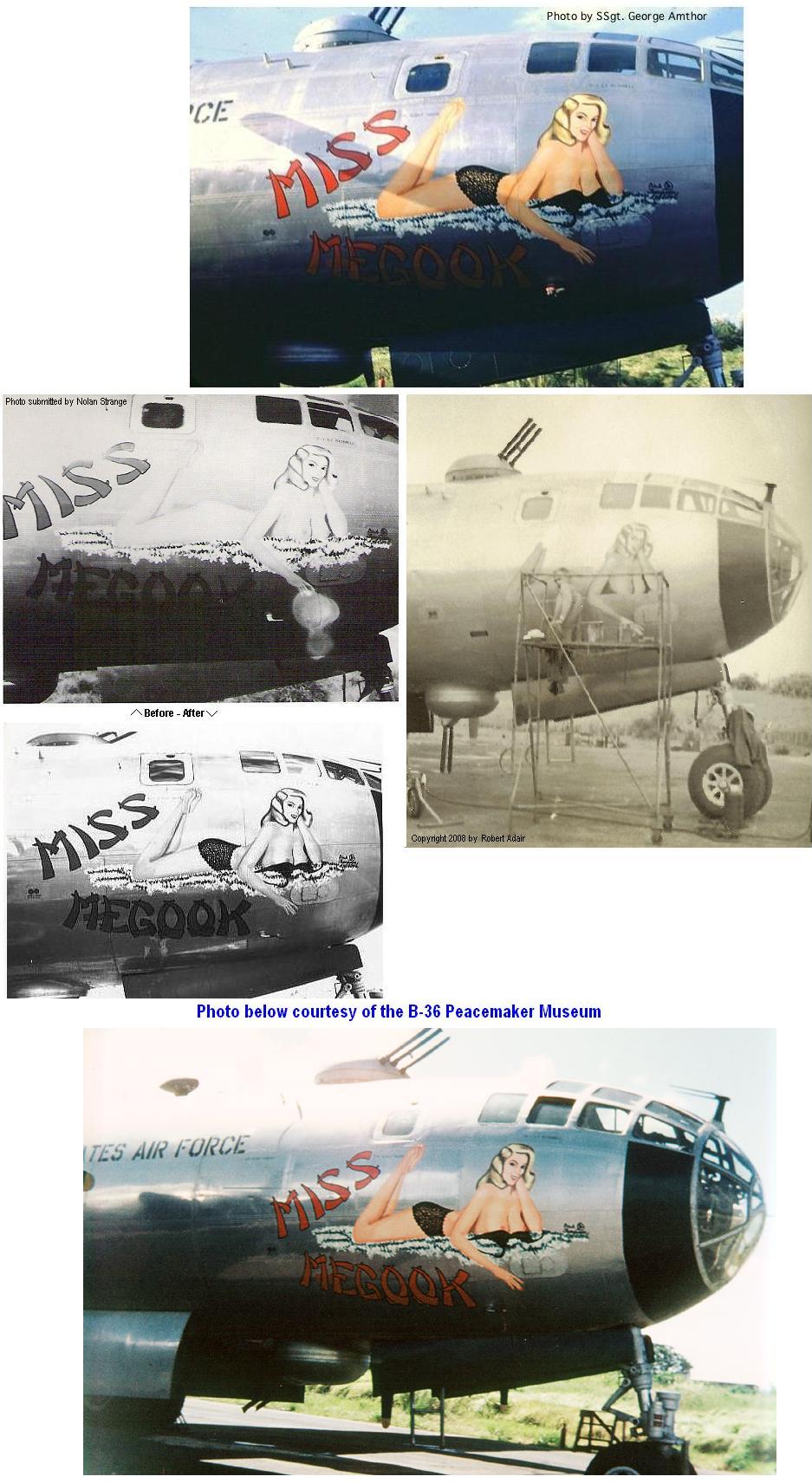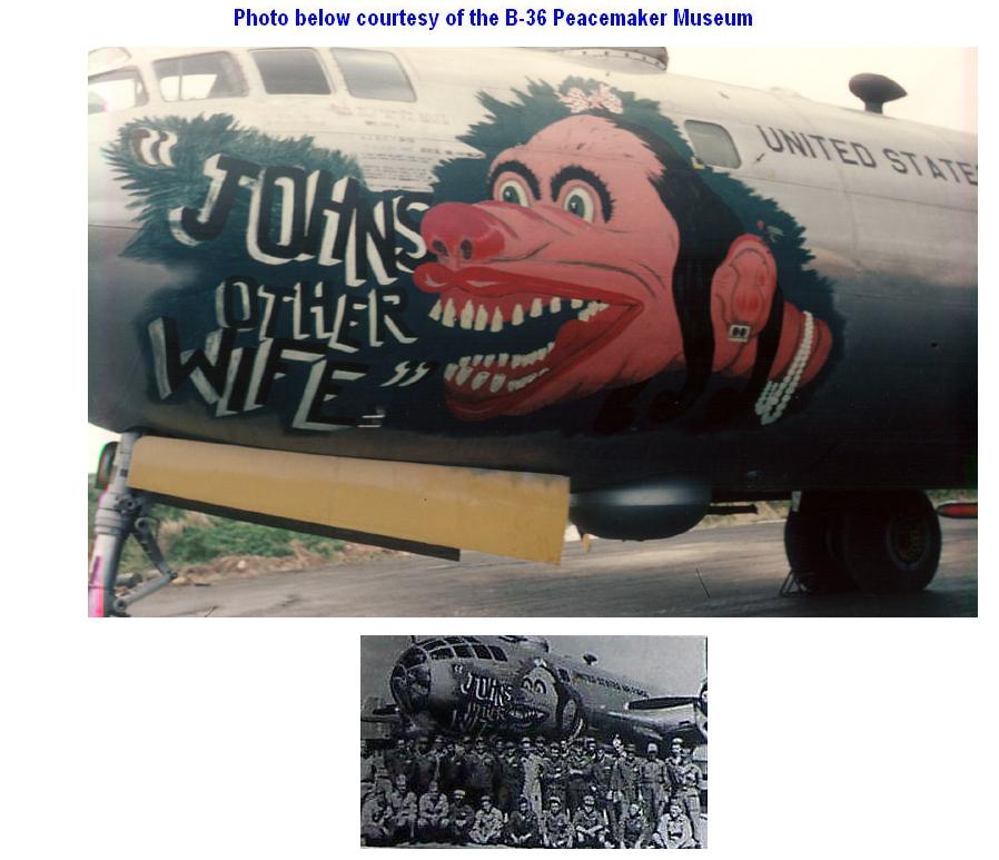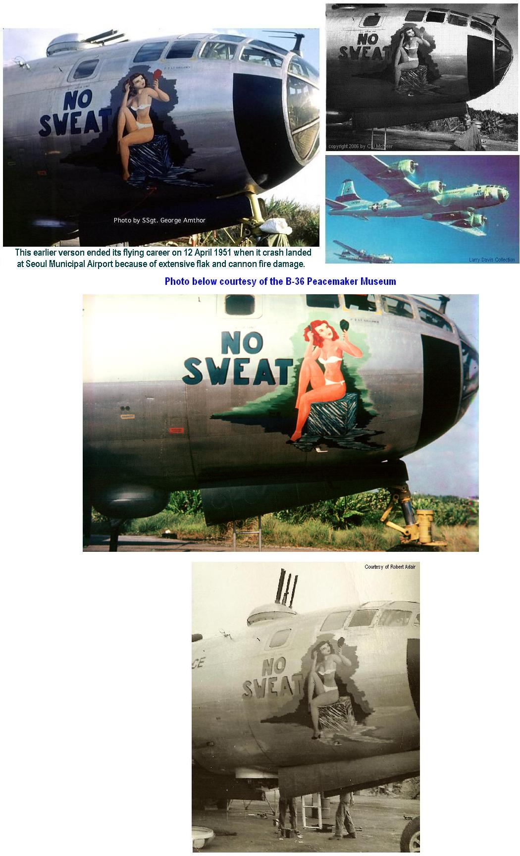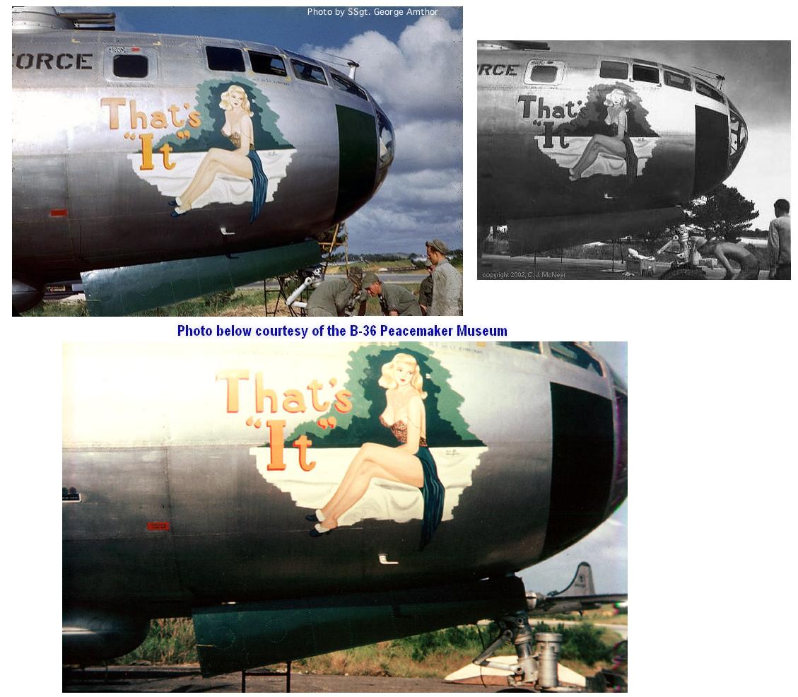 Peek of Perfection [2173] 98BG-345BS: Same serial number as Peak of Perfection  Wayne Hembree, right gunner on Capt. Bradford’s crew, wrote: " ... A/C 2173 Peek of Perfection, July 1952 to Jan 1953. When we arrived in July 52 they were just starting to paint the bellies of the 29's with black paint, since we had switched to mostly night missions. (We did fly one day mission, which was led by Gen. LeMay, and it was a "no sweat" mission  ...) When we received 2173 (in August) there was no nose art, having been painted over in black. Our left gunner and radio op took on the task of getting new nose art painted. They chose a Petty Girl body with Marilyn Monroe's head ... painted by the Japanese artist, The crew chief told us of the prior name and just for fun we changed ours from Peak of, to Peek of Perfection ... some time later in '52, a (visiting) congresswoman demanded all nose art be removed. Some of us painted it over with watercolor, but ... we eventually all lost our nose art. We completed our tour in January ‘53 with only one causality, our navigator Lt. Bird, who was shot down and lost flying with Capt. Sawyers crew ... (Force for Freedom, The Legacy of the 98th, pgs 94 to 96). The rest of us caught a MATS flight home, with no seats, and we were very happy to be heading home.