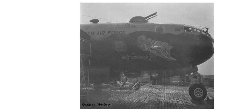 Burke’s Jerks [1721] 98BG-345BS: No photo. Jess Richey e-mailed: “(On its final flight, with Col John Grable) in the left seat and the Ops officer in the right seat, (721) was taking off (in a snowstorm), maxed-out at around 140,000#. The airplane got off the ground, but couldn't climb properly and crashed into a (450’) hill 4.7 miles north of the base. It burned 14 Japanese houses and all thirteen men onboard were killed.  This was probably the first time these two pilots ever flew with this crew.”  (The crew was regularly assigned to The Reluctant Drag’on; however, on this flight the regular Aircraft Commander, Capt. Robert Wade, was DNIF--grounded for medical reasons)  “The Co-pilot did fly that night. The crew chief (one of the best of the group) was also on board.”  AKA Tail Wind.