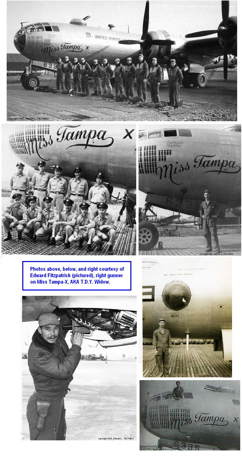 TDY Widow/ [6335] 98BG-343BS:  TDY referred to “Temporary DutY.”  In the Air Force, temporary meant “six months or less.”  Any airman would have told you that the only purpose behind TDY was to save the AF money.  In other words, the airman went “unaccompanied.”  The left-behind wife was nicknamed, “TDY Widow.”   The Ed-Fitzpatrick crew photo is an early version of the Widow that also had Miss Tampa-X painted on the port side of the nose.  After receiving battle damage on 1 June, 1951, 6335 was transferred to the 19th where it became Had a Call.)