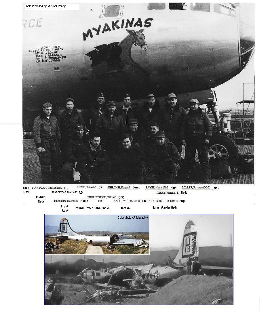 Big Ham [3974] 98BG-343 BS: No photo. The aircraft sustained flak damage while on a combat leaflet mission over Korea on 9 November 1951. The entire crew bailed out with Capt Bigham bailing out tenth over Paengnyong-Do.  Eleven crew members were rescued. Capt Bigham was not.