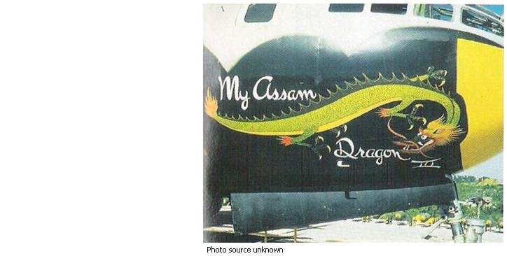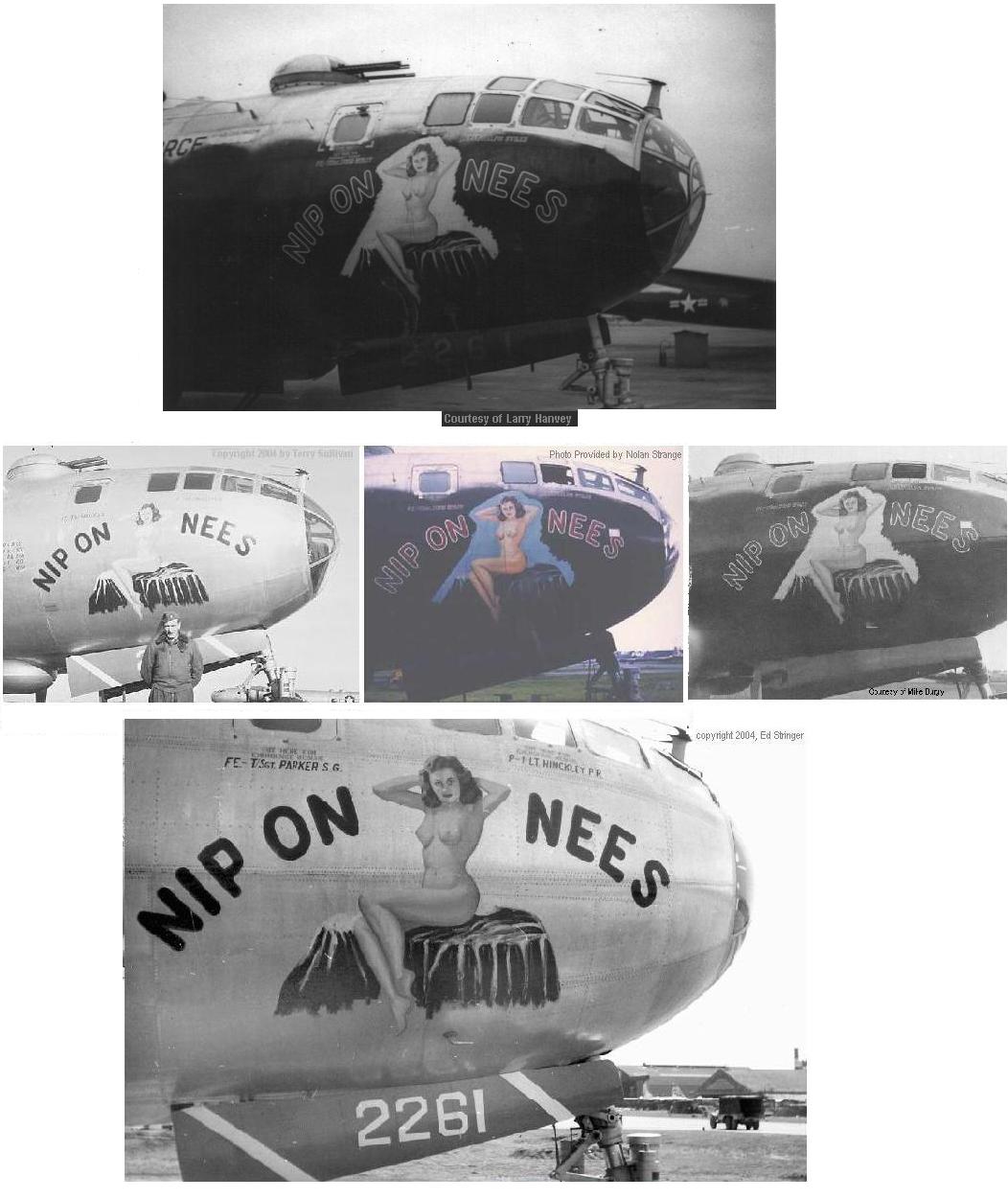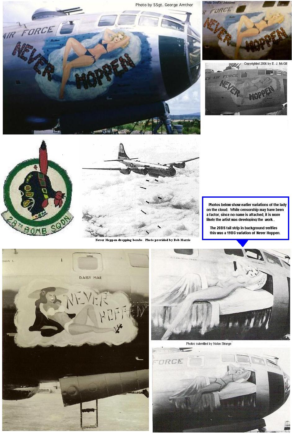 Ace in the Hole; Ah Soooooooo; Alabama Sweetheart; All Aces; All Shook; American Beauty; Any time;  Apache; Ape Ship; Ape Ship II;  As You Like It; Atomic Tom; Baby's Buggy7; Baby San; Bait Me; Beetle Bomb-er; Big Blow; Big Gass Bird; Big Ham; Big Shmoo; Black Sheep; Bluetailfly; Blue Tail Fly; Boomerang; Bub; Bugs Buster; Burke's Jerks; Bust'N the Blue; Butterfly Baby; Cami Ningyo; Capt. Sam and Ten Scents; Cat Girl; Charlie’s Wagon; Chief Mac’s 10 Little Indians; Chotto Matte; Command Decision; Cream of the Crop; Daijobu; Dead Jug; Deal Me In; Destination Known; Dinah Might; Dixie Babe; Double or Nothin'; Double Whammy; Down's Clowns; Dragon Lady; Dreamer; Duchess-Almost Ready; Dyin' Duck; Dyna Mite II; Eight Ball; Elsie; Every Man a Tiger; Fat Cat; Fifinella; Fire Ball; Flak Shack; Flying Parts; Four-A-Breast; Four of a Kind; Freshly Maid; Friendly Undertaker; Fry'In Pan; FUJIGMO; Go For Broke; Guardians of Peace; Gypsy; Had a Call;; Haulin' Ass; Hawg Wild; Hearts Desire; Heart's Desire II; Heavenly Laden; Hey Doc; Homing De-vice; Homogenized Ethyl; Honeybucket Honshos; Hot Box; Hot To Go; Hot'T Trot; Hoxie's Hoax, Island Queen; Jita; John's Other Wife; Koza Kid; Lady Be Good; Lady in Dis-Dress; Laggin Wagon; Lake Success Express; Lemon Drop Kid; Leo the Lion; Lil Darlin; Loaded Lady; Loaded Leven; Lonely Lady;  Lonely Lady Under New Management; Lonesome Polecat II; Los Angeles Calling; Lubricating Lady; Lucifer; Lucky Dog; Lucky Strike; Mac's Effort; Mais Oui; Margie's Mad Greek; Mason's Honey; Max Effort; Me Worry; Miss Behavin; Miss Fortune; Mission Accomplished; Mission Inn; Miss Jackie the Rebel; Miss Liberty Belle; Miss Manuki; Miss Manukie; Miss Megook; Miss Minooky; Miss N. C; Miss Spokane; Miss Tampa-X; Miss Yankee Doodle; Moon's Moonbeam; M.P.I; Mule Train; Myakinas; Myasis Dragon; My Assam Dragon III; Never Hoppen; Night Affair; Night-Mare; Nip On Nees; Nip-Pon-Ese; No Name 1; No Name 2; No Name 3; No Sweat; Old Grandma; Old Wild Goose; On Call; Our Baby; Our Gal (1); Our Gal; Our L' Lass; Outlaw; Over Exposed; "Over Exposed; Paddy Daddy; Pa-Pa-San's Parasites; Peace Maker; Peace Maker; Peace on Earth; Peak of Perfection; Peek of Perfection; Persuade Her; Phippens Pippens; Piece On Earth; Police Action; Pride of Brooklyn; Punch Bowl Queen; Purple Shaft; Rapid Rabbit; Raz 'N Hell; Ready Willin Wanton; Reddy; Reluctant Drag'on; Reserved; Rock Happy; Rough Roman; SAC Mate; SAC Queen; SAC's Appeal; Sad Sack; Sad S*A*C*; Salem Witch; Schlimeil of Fortune; September Song; Shack Rabbit; Shady Lady; Sheer Madness; Sheeza Goer!; Shinpainai; Short Time Only; Shutterbug; Sic' Em; Sit'n'git; Skivvy Girl; Slick Chick; Slicka Chicka; Slow Freight; Snake Bit; Snoopy Droopy; Snugglebunny; Society Leader; Soft Touch; Sophisticated Bum; So Tired; Southern Comfort; Southern Comfort (2); South Sea Sinner; Space Mistress; Spirit of Freeport; Spittin Kittin; Squeeze Play; Star Duster; Stateside Reject; Stinger Queen; Sucoshi Ni; Sun Bonnet King; Sure Thing; Sweet Judy 2; Tail Wind; Target Tonight; [Tarzon1]; TDY Widow; TDY Widow II, That's It; Tiger Lil; Todlin Turtle; To Each His Own; Tondemonai; Top of the Mark; Touch & Go; Town Pump; Tremlin Gremlins; Trouble Brewer; Typhoon Goon II; UGG-LY; Undecided ; United Notions; U.S. Mule; Vicious Roomer; Wanderer; Where Next?; Where Next; Who's Next; Wild Goose; Winchester 73-Red Raider; Wolf Pack; Wright's Delight; Worry Bird; ZE TAINT.