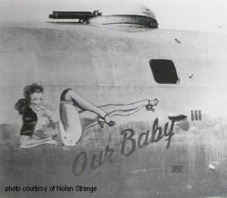 Baby San [6290]/ 98BG: The pigeon-Japanese word “Baby-san” meant very young—usually applied to the youngest member of a crew.  The tail gunner was often the “Baby-san” of the crew.  Baby San was also used to describe young girls, as appears to be the case with this nose art.  I can’t make out what she’s holding in her raised hand or why there is the ace and two face cards have been discarded.  Also named Phippen’s Pippens.  Lee Brunell wrote that the back of his photo was inscribed with, "When they go looking for trouble and [sic] usually find it."