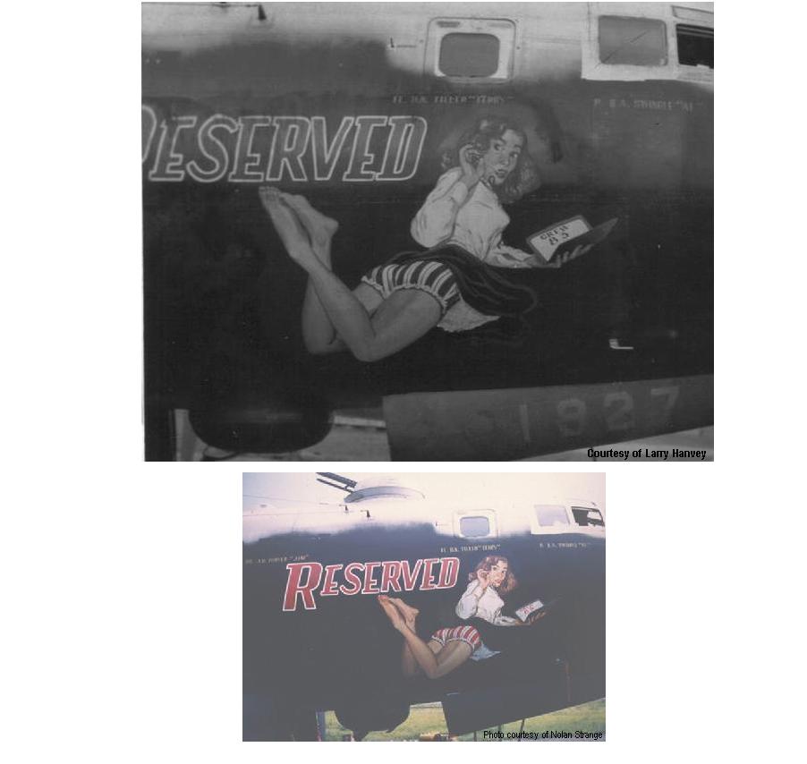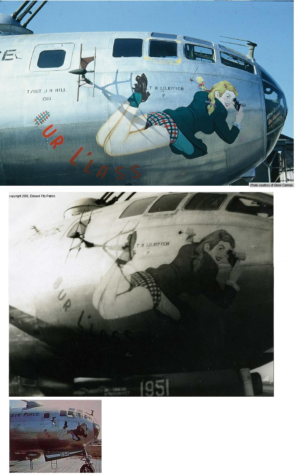 Four of A Kind [9999] 19BG–30BS: In the linked photo the aircraft’s belly is being painted black for night missions.  We think the yellow is some sort of primer but are not sure. Also, although this was identified as Four of a Kind, unfortunately, the nose art is painted over. The other photo verifies the tail number “9999,” which would give us “four-of-a-kind” and logically seem to be the correct number.  9999  has also been verified as "Sure Thing," and it seems likely it had the same nose art with the name change.