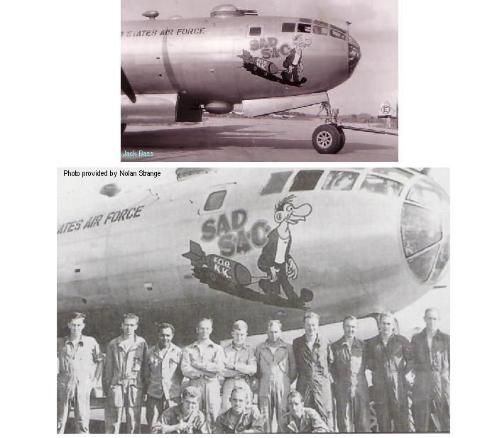 SAD SAC (T.D.Y.) [1676] 98BG-343BS: One of two with same name, different outfit, different nose art. Sad Sack was a GI cartoon character popularized during WW II.  The spelling difference is an obvious reference to SAC (Strategic Air Command). TDY stands for “temporary duty.”   This later Sad Sack is truly sad.  His service stripes may offer a clue to why he is not happy to be going into another one.   Click for one of Max Nelson's great photos of SAD SAC on combat bombing run moments before MiGs attack.