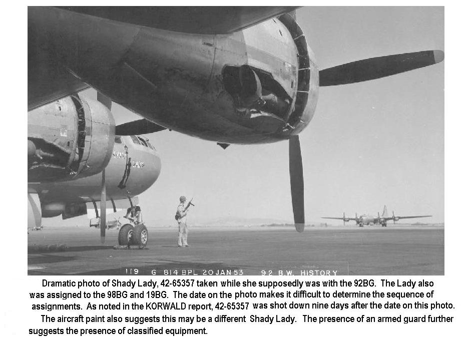 Shady Lady [5357] 98BG:  After being heavily damaged by flak & MiGs Lady was returned to the states, overhauled & sent to the 19th BG. and became Double or Nothin.  It was shot down on 29 January, 1953 near Pyongyang.