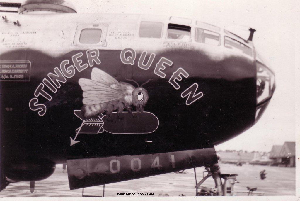 Stinger Queen [0041] 98BG: Lt. John Zieser, like so many reservists who had served in WWII, was called up and eventually wound up the radar operator (RO or VO) on Stinger Queen.  His son (also John) wrote that his father once said that the Nose Art and his "window" were not on the plane very long because an AF directive came out that authorized only tail numbers and insignia to be painted on the black planes.