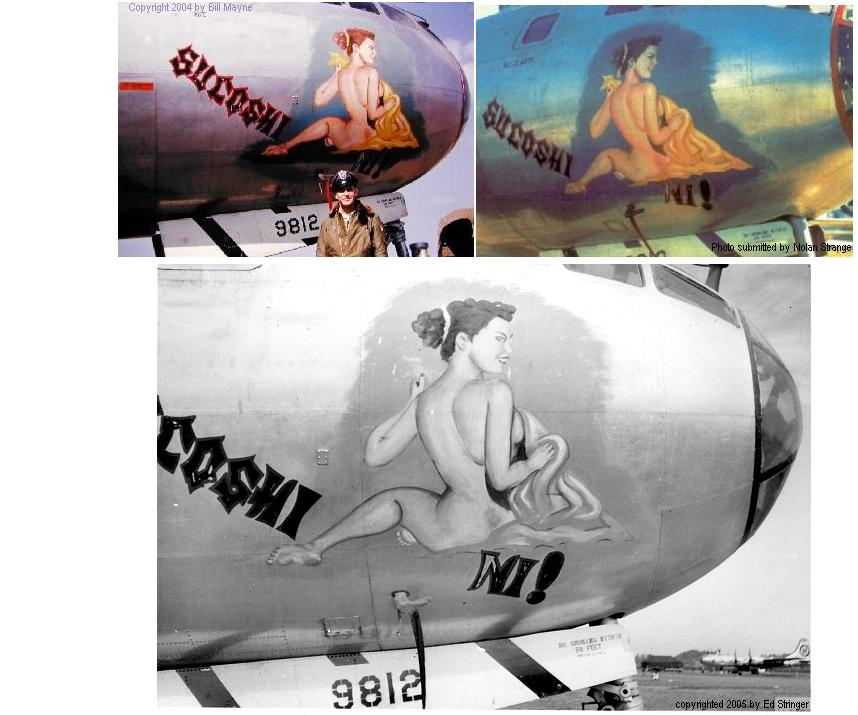 Sucoshi Ni! [9812] 98BG-345BS: There are two Sucoshi nose art paintings.  The other can be viewed by scrolling down on Sally Ann’s nose art page. Mike Sawyer clarified the Japanese meaning with the following: "Sucoshi ni" is Japanese, but should be spelled "sukoshi ni." You are correct, "sukoshi" is "little." "Ni" could mean "to" or "toward." In this context, "sukoshi ni" would probably mean "just a little bit more." The airman in the photo is identified as “Dave.”  See also Fry’In Pan.