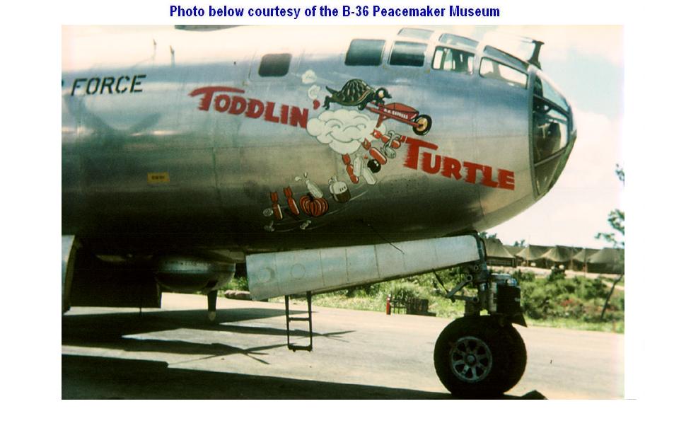 Toddlin’ Turtle [UNK] 22BG: Turtle was an early arrival in the Korean War, rushed to Kadena to fly combat in the summer of 1950.  Among the munitions being dropped on the target is a jug of moonshine and assorted UFOs (Unidentified Falling Objects).  Note the tent city in the background.