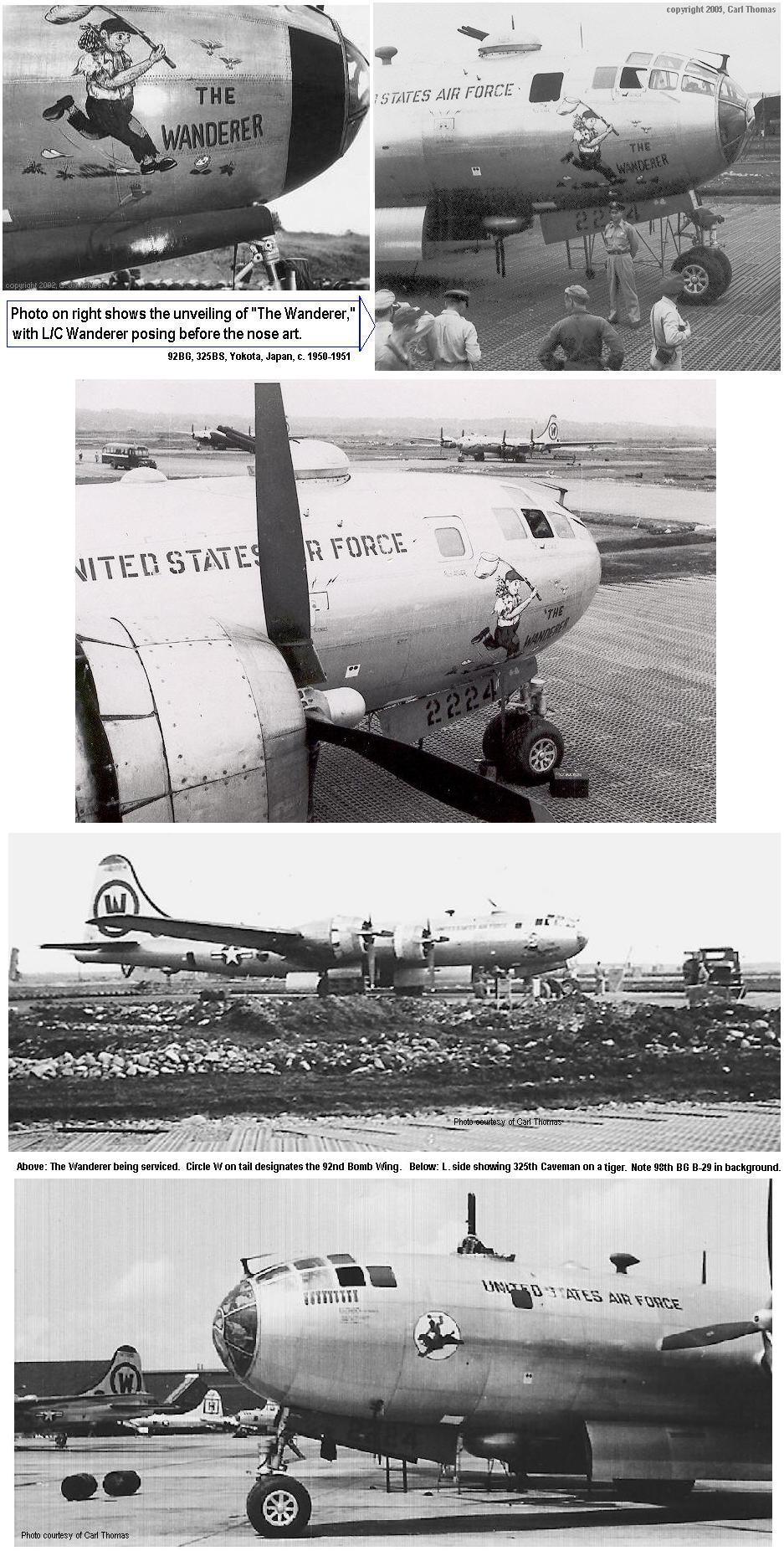 Wanderer, The [2224] 92BG-325BS/98BG-345 BS: (circa 1950-1951) A bum chases butterflies are actually colonel’s eagles.  The “bum” is Lt. Col. Ralph Wanderer, apparently up for full colonel.   This nose art emphasizes the gap between the U.S. Army and Air Force rank structure.  Even L/Cs took good-natured ribbing from their crews.  Jim Peters, former member of the 325BS, writes, "Lt. Col.Wanderer, CO of the 326th and pilot on The Wanderer did not care for his CO ... he had a Japanese artist paint a Tramp chasing two butterflies with a net (Actually two Full Colonel’s insignia,) and even put a small outhouse in the lower right corner, with a couple of flowers and two flies or bees circling the outhouse.  The unveiling was accomplished one morning, with . . . anyone who could be rounded up (invited) ... (this was) before the 98th BG arrived at Yokota. Needless to say, Lt Colonel Wanderer was embarrassed (he had a very red face) at the unveiling, and ... was kidded about the artwork. ...  Lt Col Wanderer was insistent that The Wanderer would not be returned to the ZI, and apparently (it) was transferred to the 98th BG."  Carl Thomas, who submitted the photo of the unveiling, writes: My Dad was the radio operator on the 44-62224(The Wanderer) … unveiling, with Lt. Col. Wanderer shown in it. The Group is the 92nd BG, 325 BS, in Yokota, Japan in 1950 or 51. (Thomas)